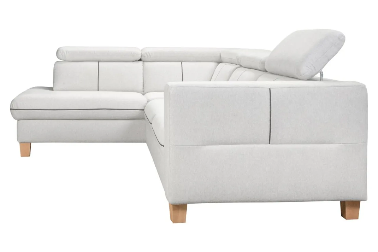 Do obicia narożnika wykorzystano tkaninę POLARIS. Tkanina jest odporna na mechacenie i ścieranie. Jej cechą charakterystyczną jest wyraźny splot nitek, który tworzy interesujący efekt wizualny. Kremowy narożnik posiada wyraziste, szare przeszycia, ładnie komponujące się z drewnianymi nóżkami.