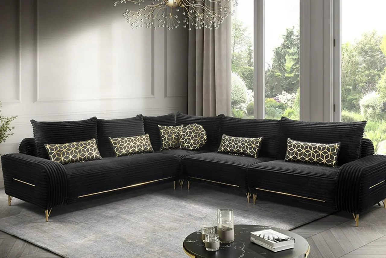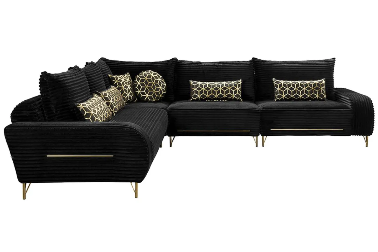 - Narożnik świetnie sprawdzi się w dużym, otwartym salonie. Czarny sztruks i złote dodatki tworzą mebel, który wpasuje w nowoczesne i glamour wnętrza. Geometryczne wzory na poduszkach będą świetnie wyglądać także w afrykańskich aranżacjach.