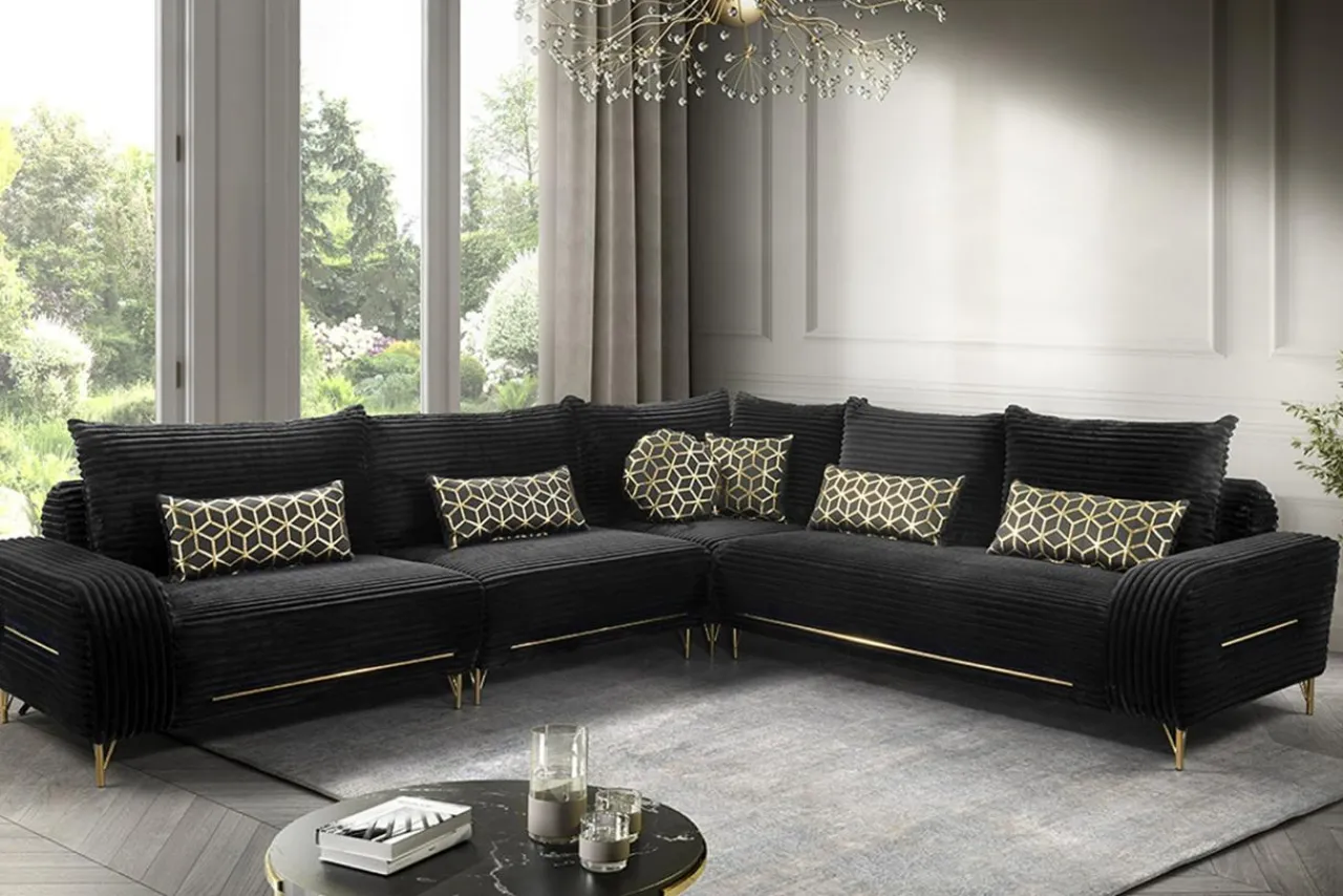 - Narożnik świetnie sprawdzi się w dużym, otwartym salonie. Czarny sztruks i złote dodatki tworzą mebel, który wpasuje w nowoczesne i glamour wnętrza. Geometryczne wzory na poduszkach będą świetnie wyglądać także w afrykańskich aranżacjach.