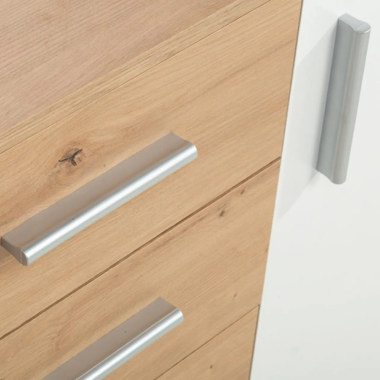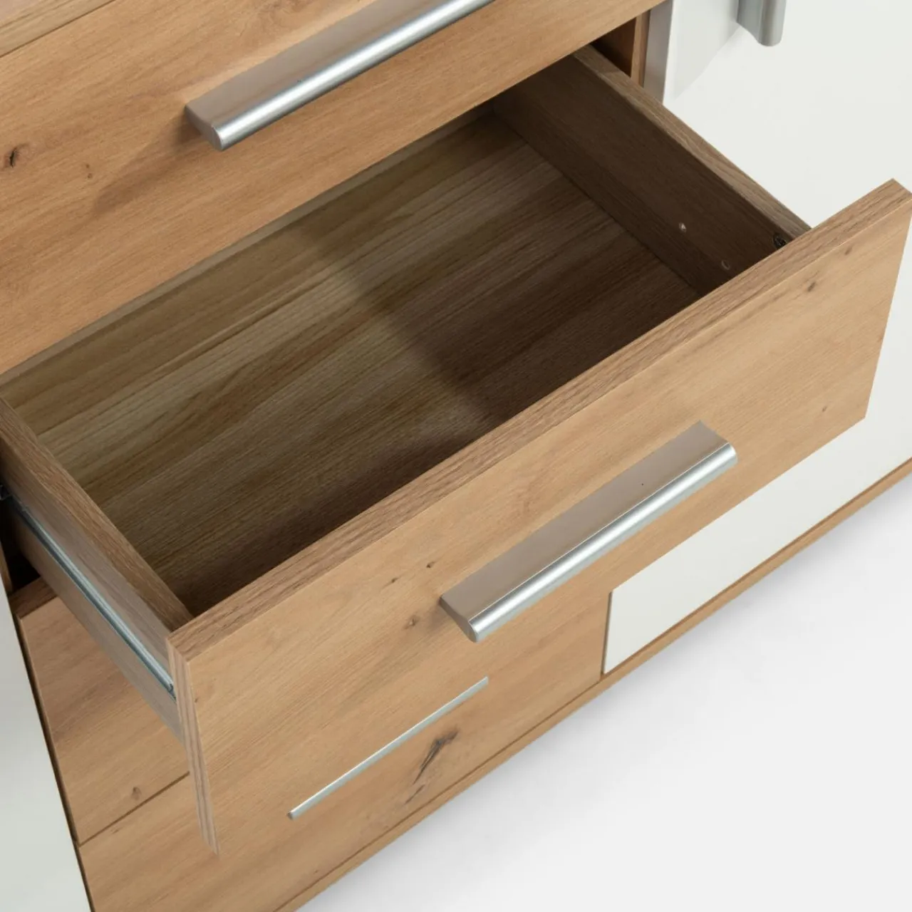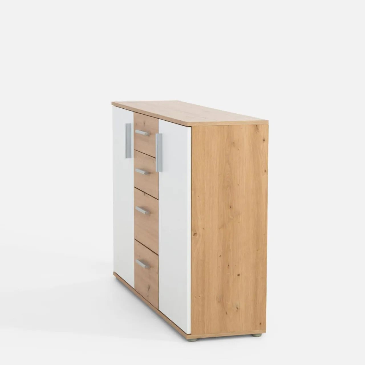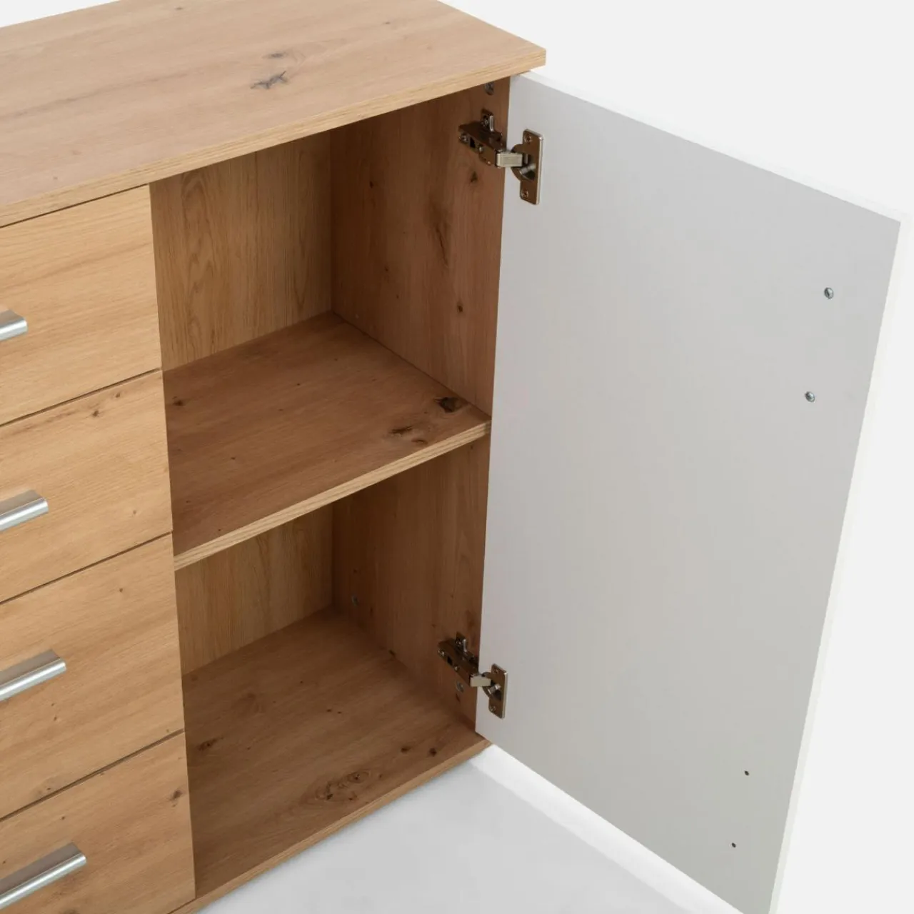 Komody IKOLI łączą nowoczesny design z praktycznym przechowywaniem. Jasne fronty i korpus w odcieniu dębu artisan dodają wnętrzu lekkości. Różne układy – od prostych dwudrzwiowych modeli po warianty z szufladami – sprawdzą się w salonie, sypialni czy biurze.