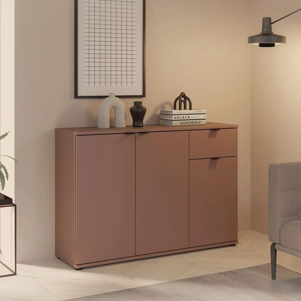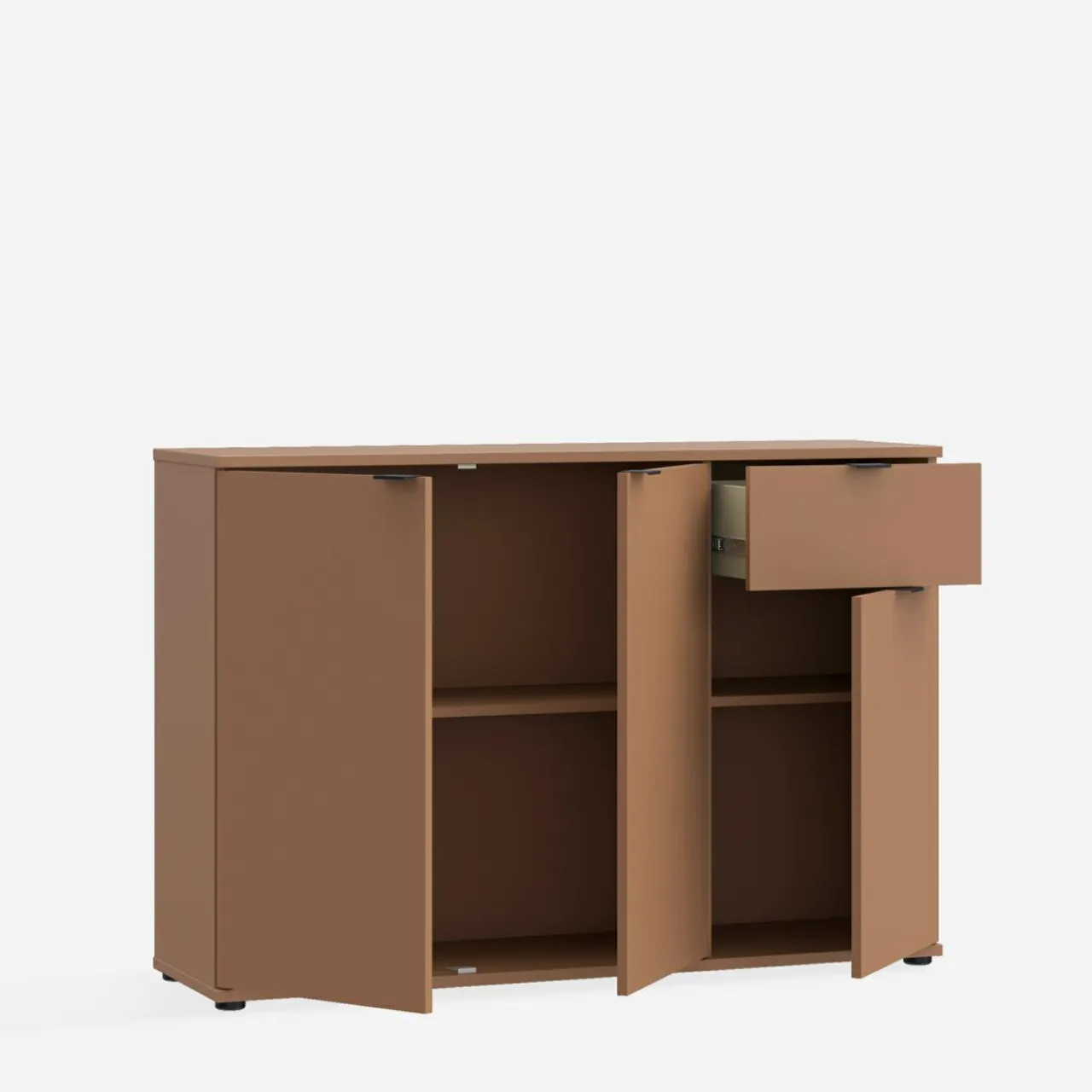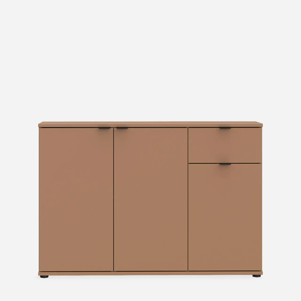 Komoda 3-drzwiowa z szufladą GANYMEDE w odcieniu terrakoty to propozycja do wnętrz o ciepłej atmosferze. Połączenie szafek i szuflady zapewnia wygodne przechowywanie.