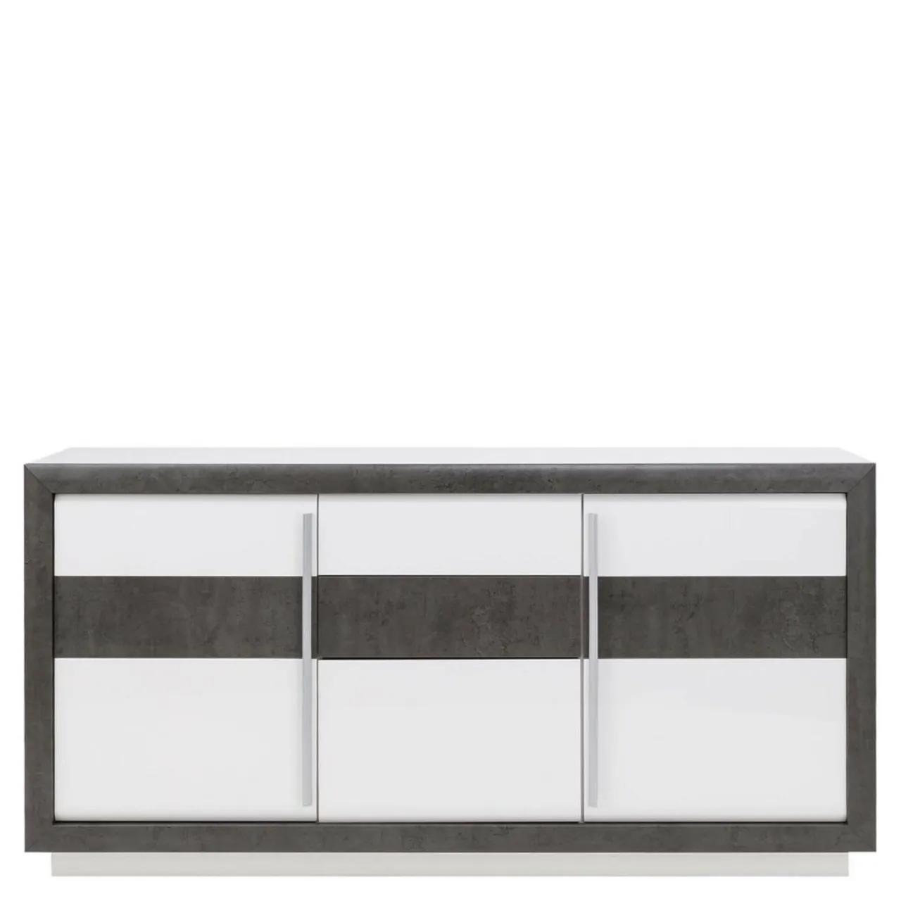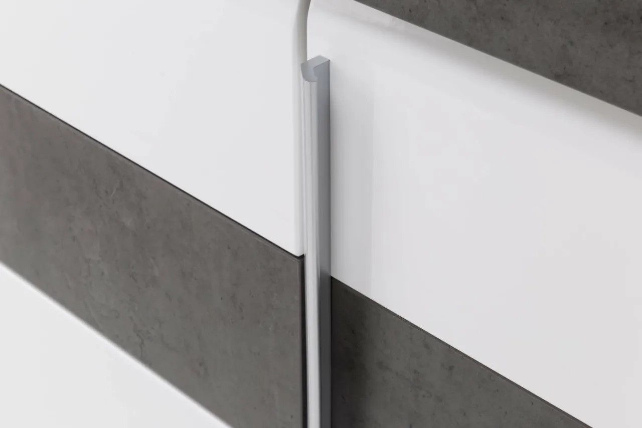 Komoda cechuje się masywną ramą, która najbardziej zwraca na siebie uwagę. Wydaje się okalać całą bryłę i jeszcze bardziej podkreśla trójwymiarowość. Kolejnym wyróżniającym elementem są pionowe i długie uchwyty w kolorze aluminium.