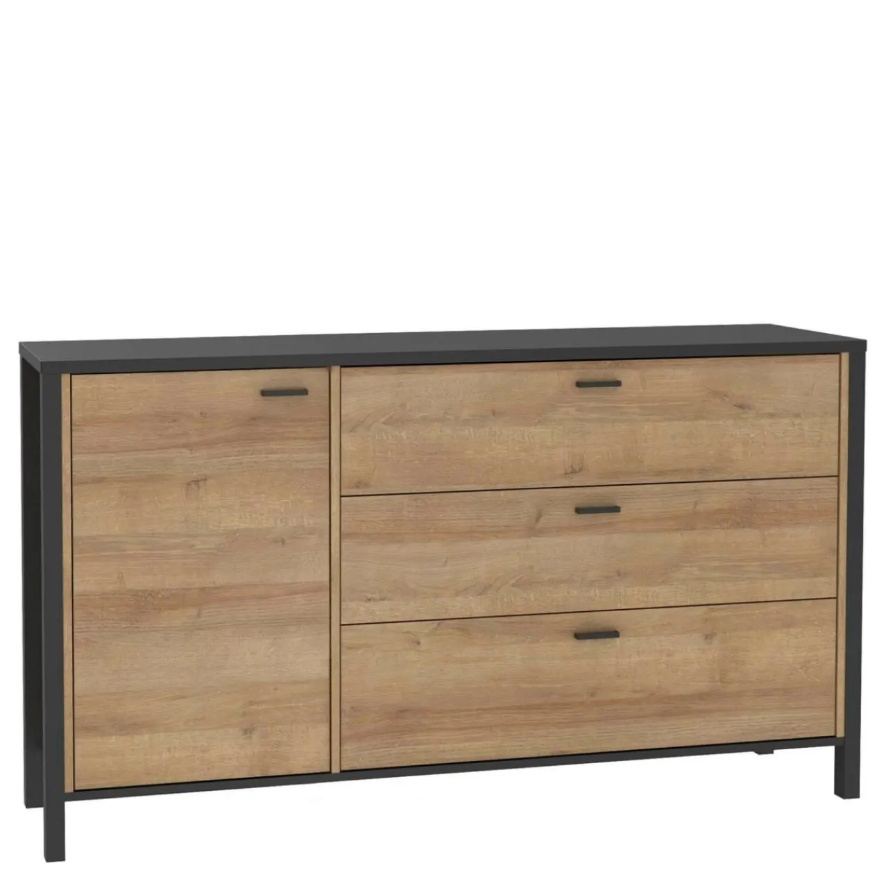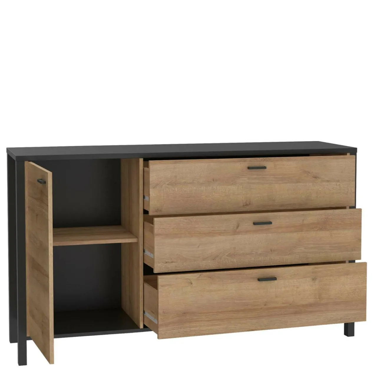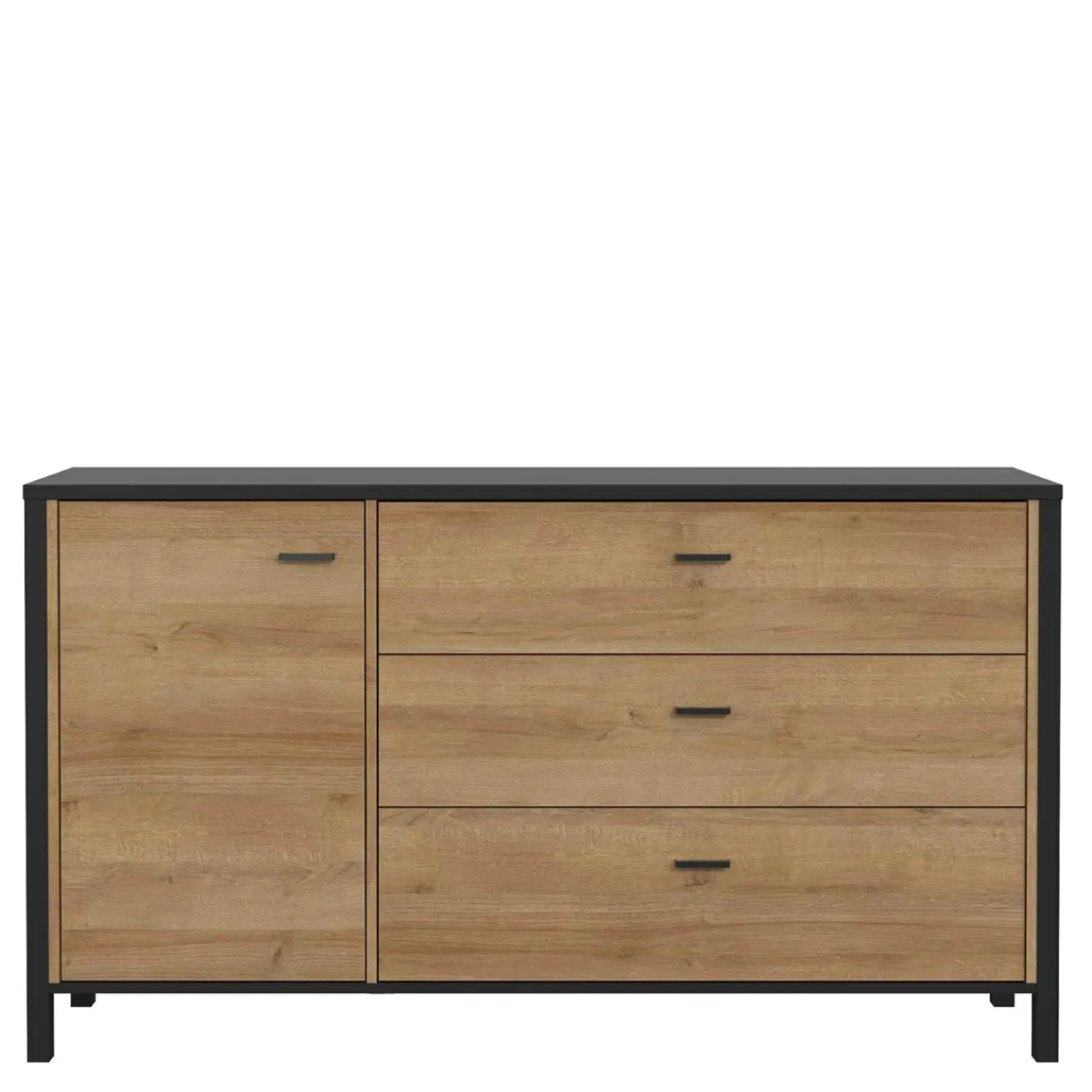 - Komoda posiada 1 zamykaną szafkę oraz 3 szuflady, wyposażone w prowadnice kulkowe.
