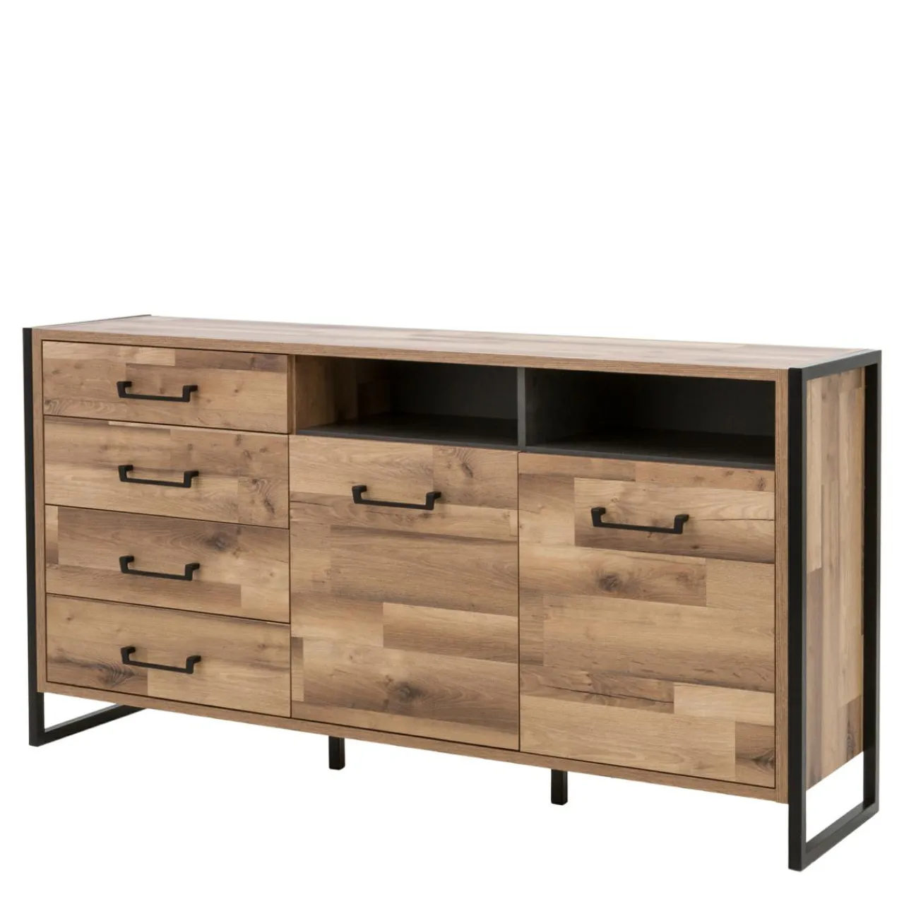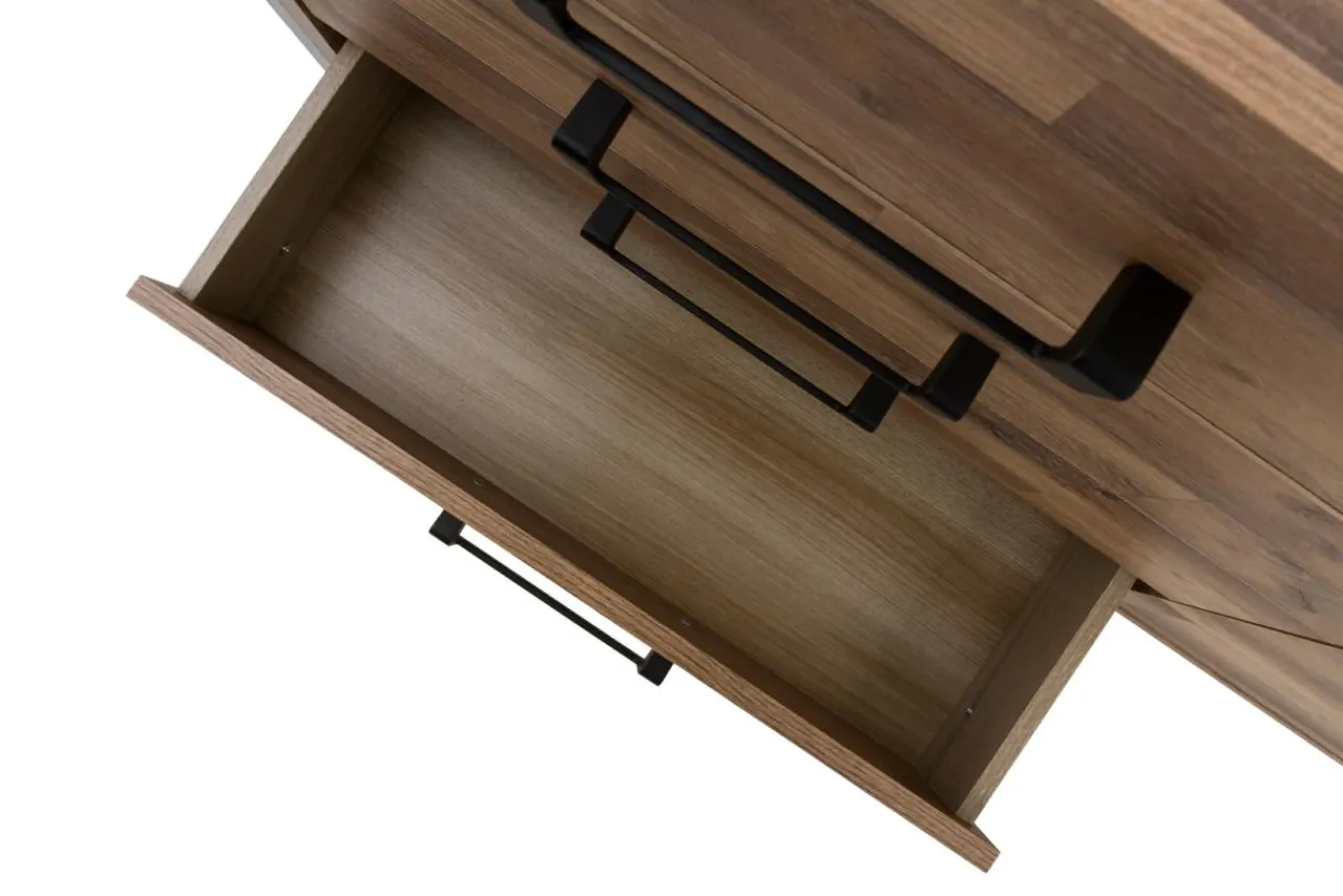 Komoda HUD została wykonana z płyty meblowej wykończonej folią. Gustownym dopełnieniem są metalowe uchwyty w czarnym kolorze, które korespondują z profilem spełniającym role nóżek mebla.