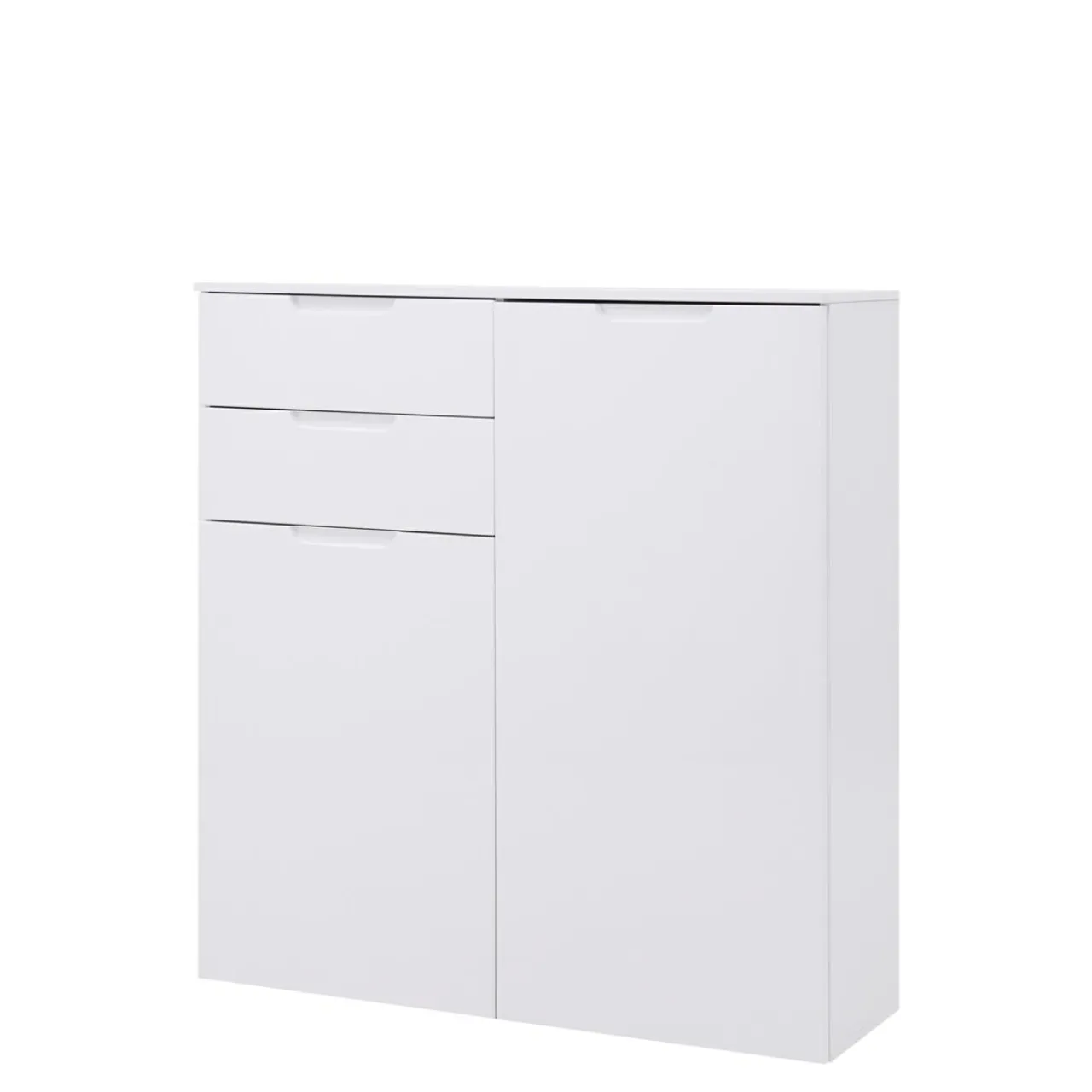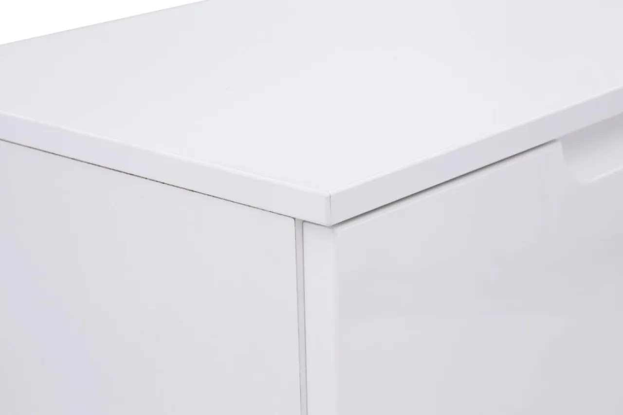 - Komoda wykonana jest z płyt meblowych i wykończona folią. Białe, połyskujące fronty powiększą optycznie przestrzeń.
