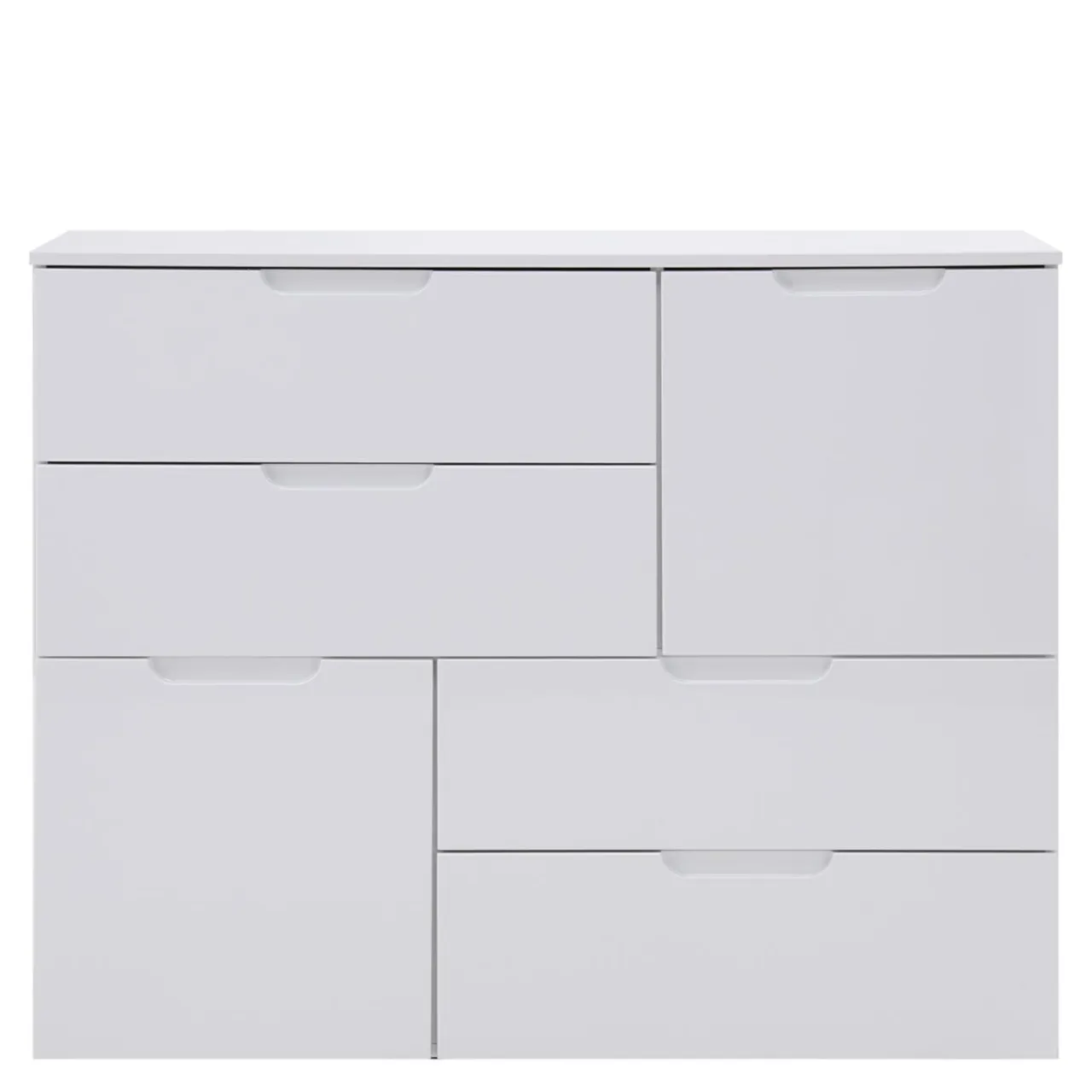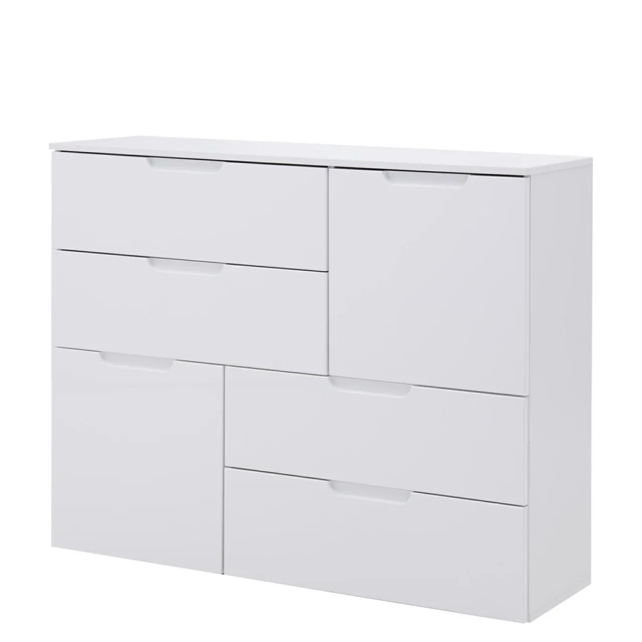 - Komoda wykonana jest z płyt meblowych i wykończona folią. Białe, połyskujące fronty rozświetlą i ożywią pomieszczenie.