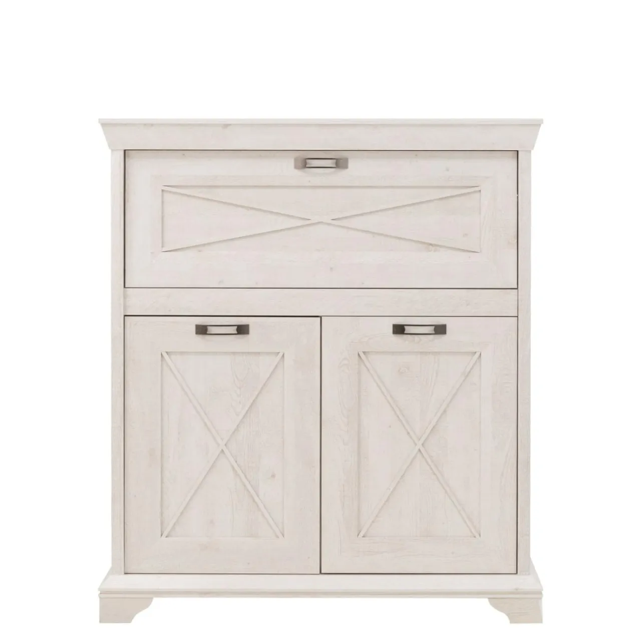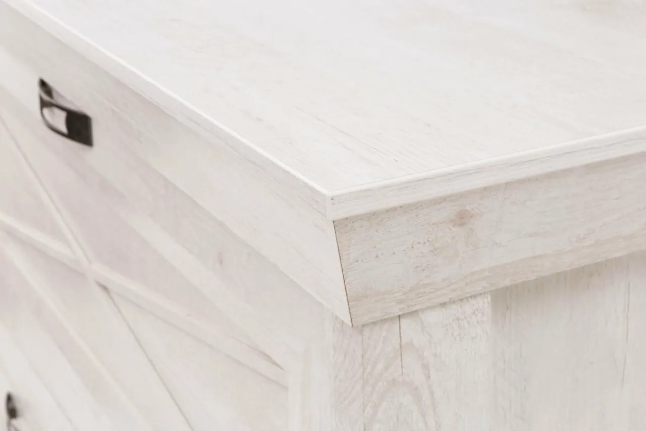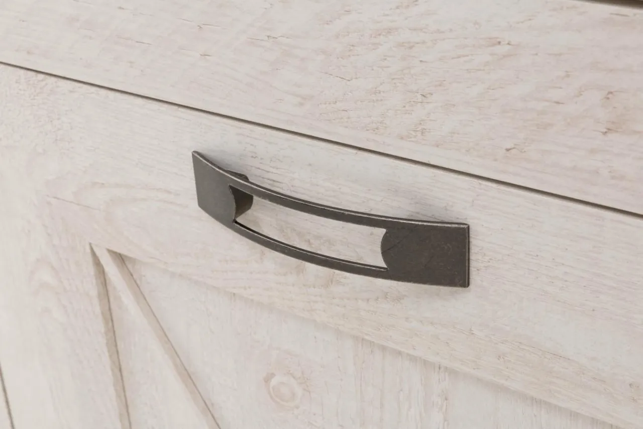 Wybarwienie w chłodnym odcieniu wpasuje się w większość współczesnych wnętrz. Komodę wykończono folią imitującą strukturę sosnowego drewna (pinia biała), dzięki czemu zyskuje ona nietuzinkowy wygląd.