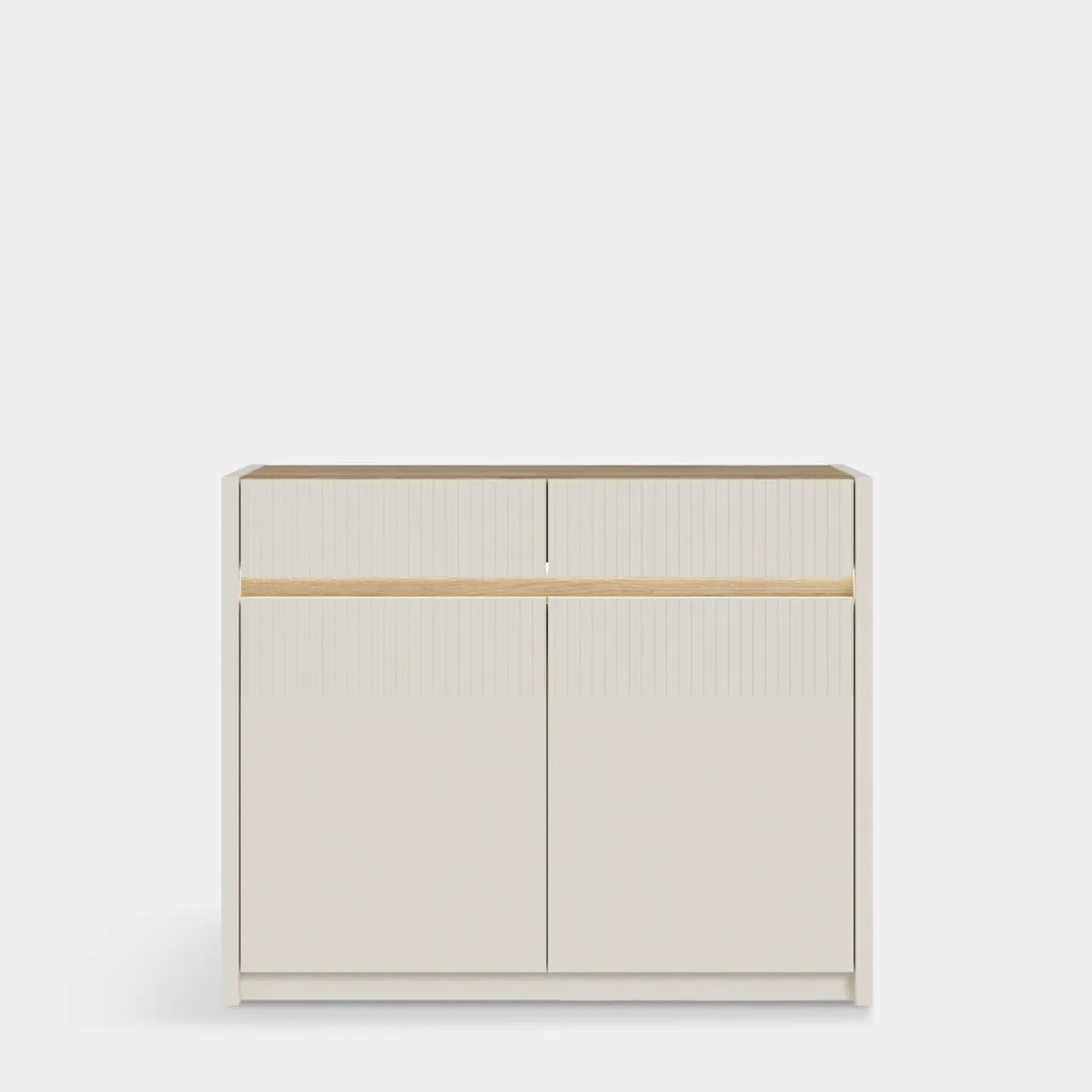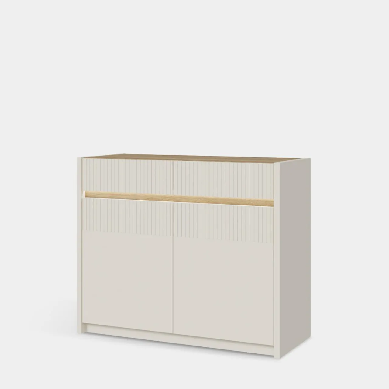 Komoda OAK SQUERE ma zaledwie 105,3 cm szerokości a oferuje miejsce w 2 szufladach i w 4 wnękach zamkniętych.