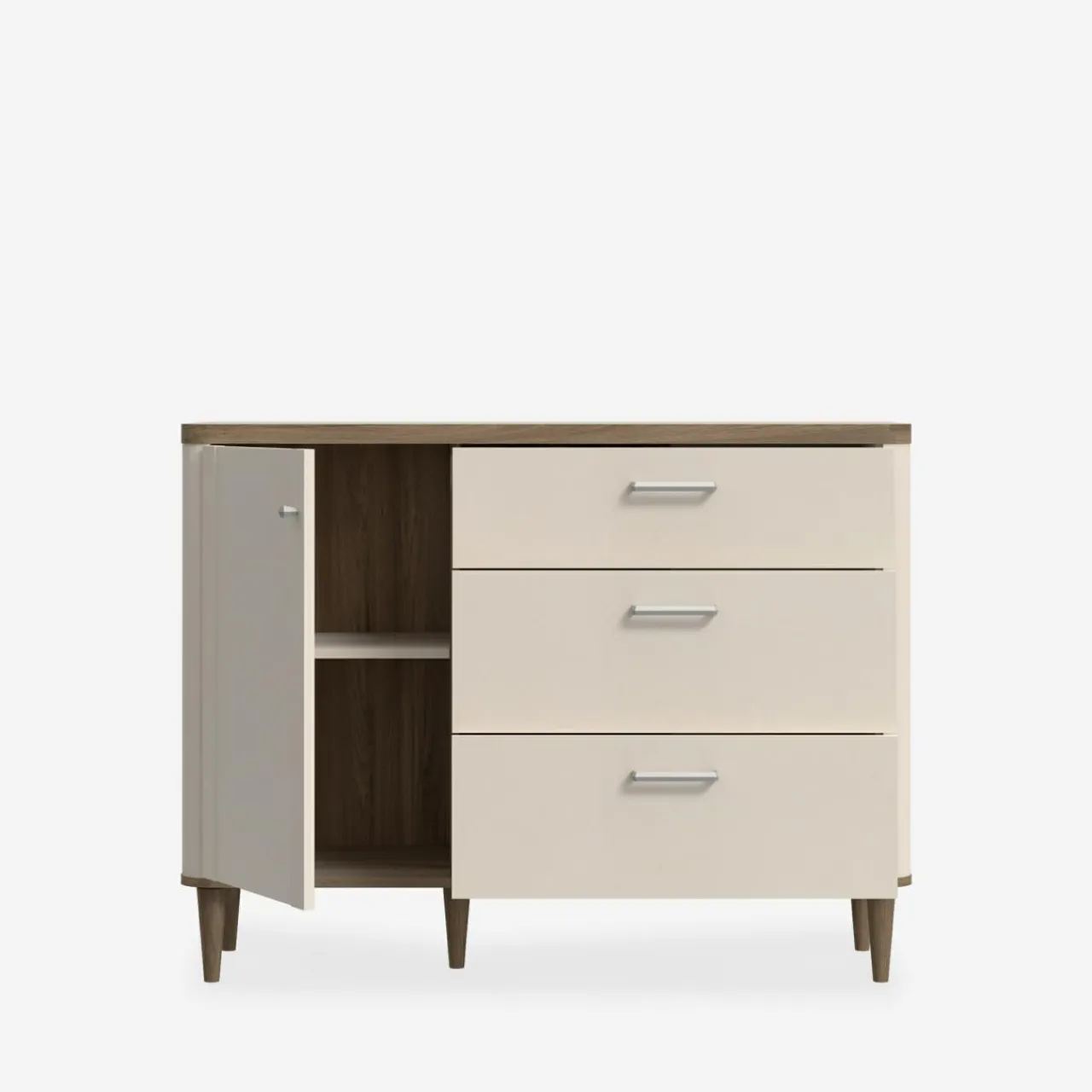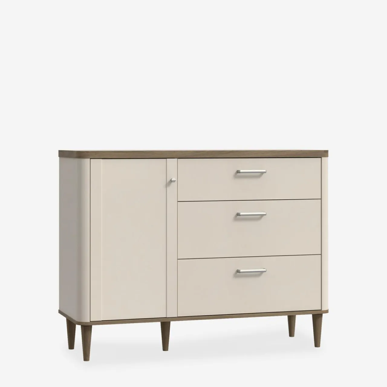 - Delikatnie zaokrąglone kształty korpusów, blatów i nóżek dodają lekkości, wprowadzając harmonię do wnętrza.