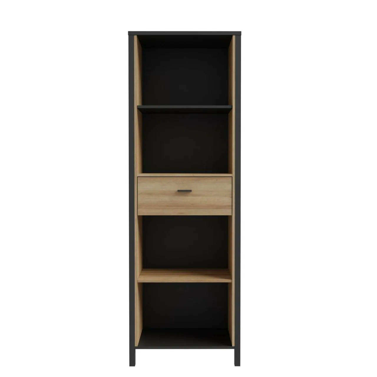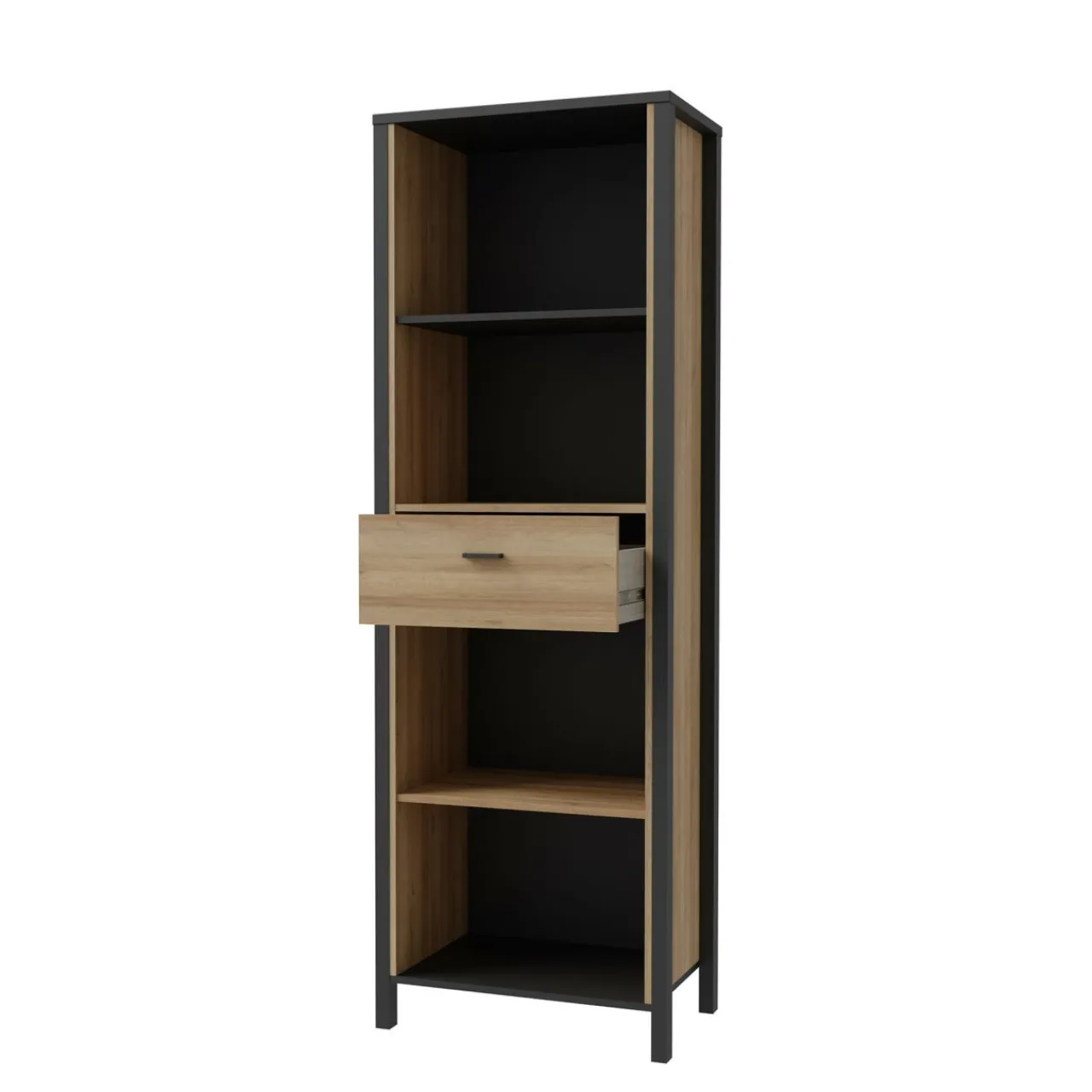 - Regał posiada 1 szufladę, wyposażoną w prowadnice kulkowe oraz 4 otwarte wnęki.