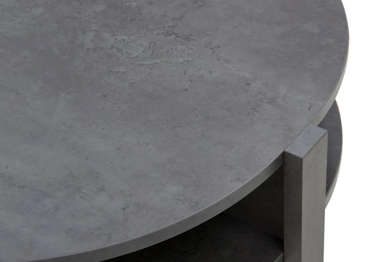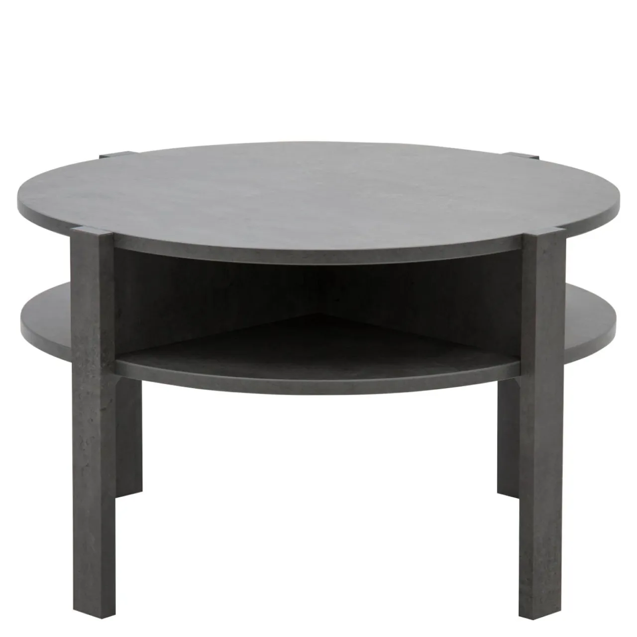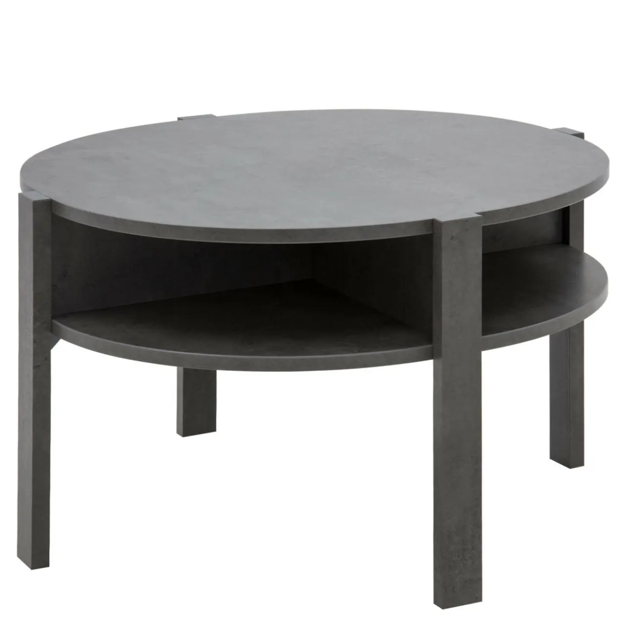 Okrągły stolik TOBAGO w ciemnoszarym kolorze imitującym beton dobrze wkomponuje się w industrialne, loftowe lub nowoczesne mieszkania.