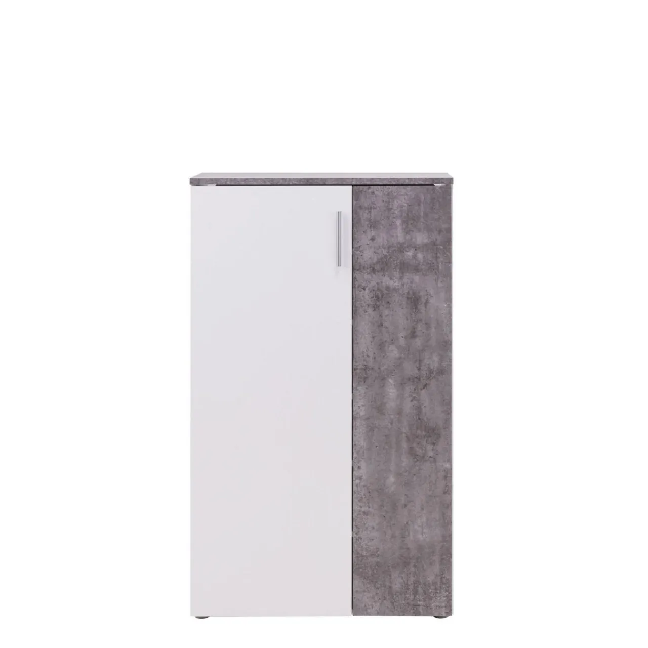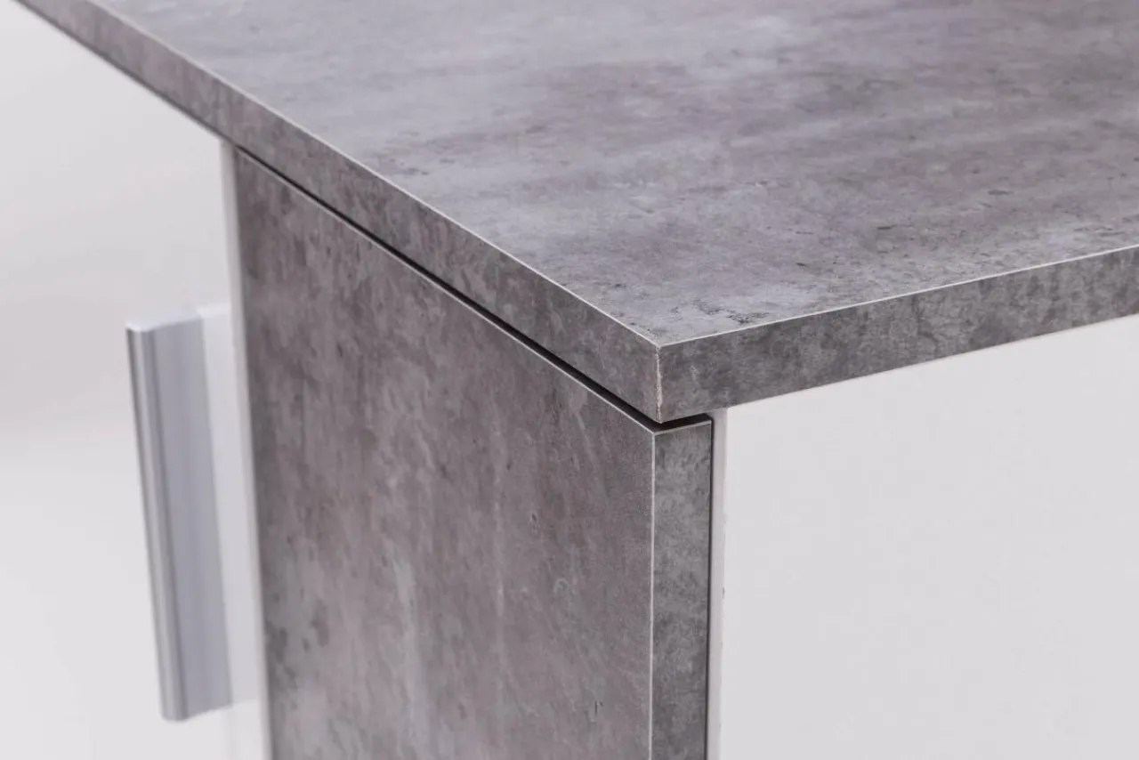 Szafka ma wystarczającą pojemność dla całej rodziny. Kolorystyka szafki to jasnoszary beton i biel, która świetnie wpisuje się w aktualne trendy.