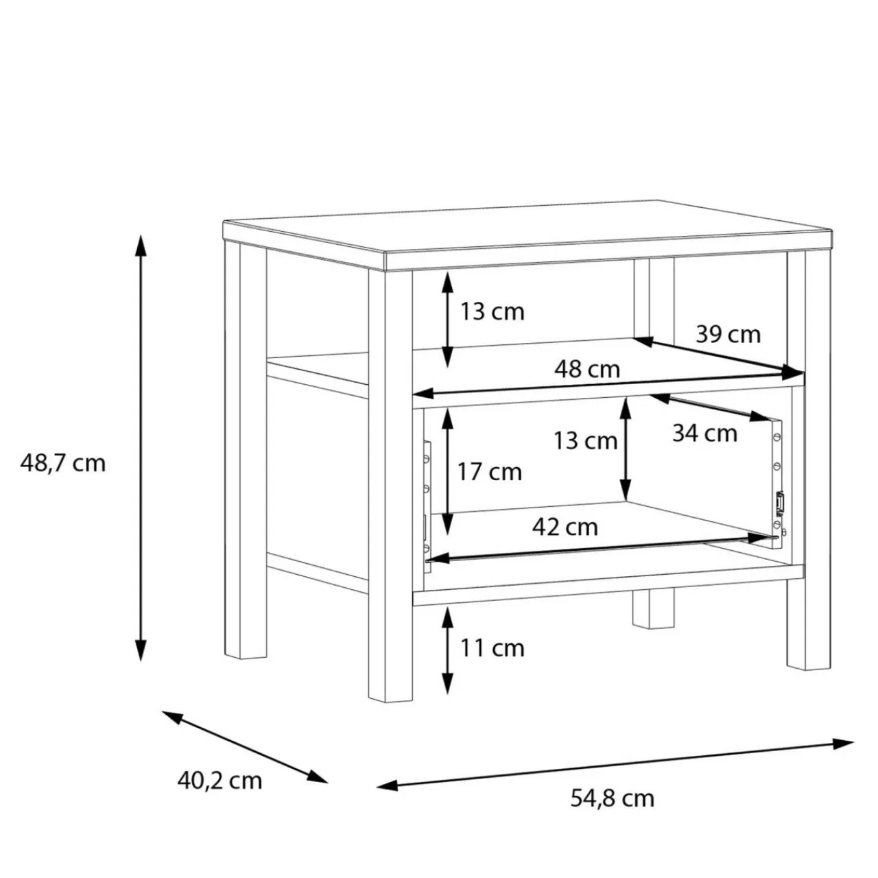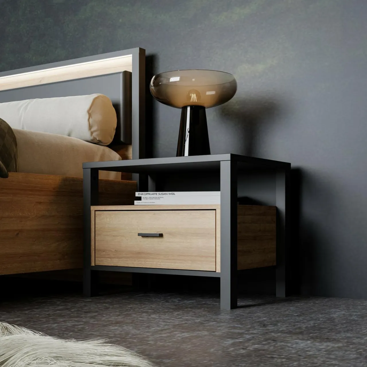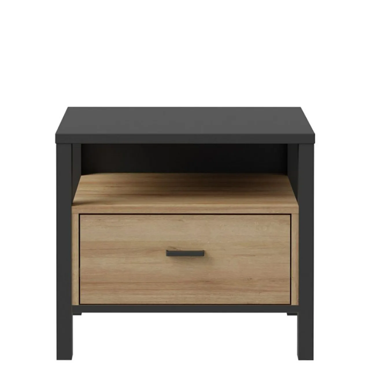 Szafka nocna posiada 1 szufladę na prowadnicach kulkowych oraz otwartą wnękę pod blatem. W jej wnętrzu możesz trzymać kosmetyki, książkę lub osobiste drobiazgi.