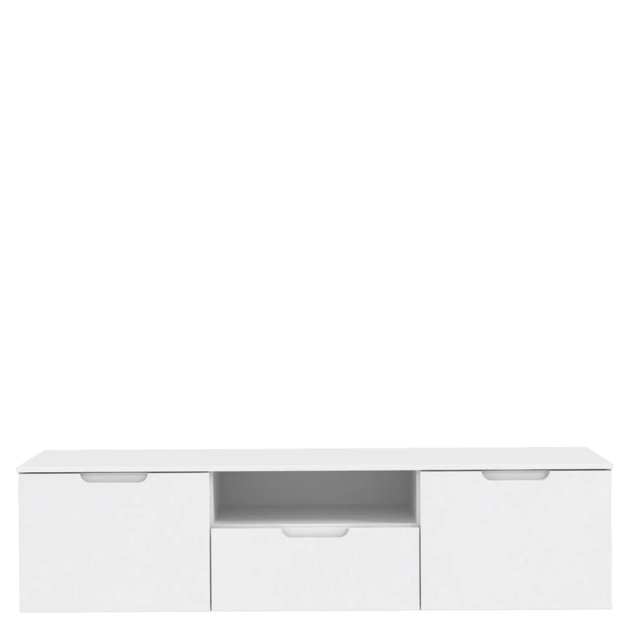 Niska szafka w białym kolorze estetycznie wkomponuje się we wnętrze salonu, powiększy optycznie przestrzeń.