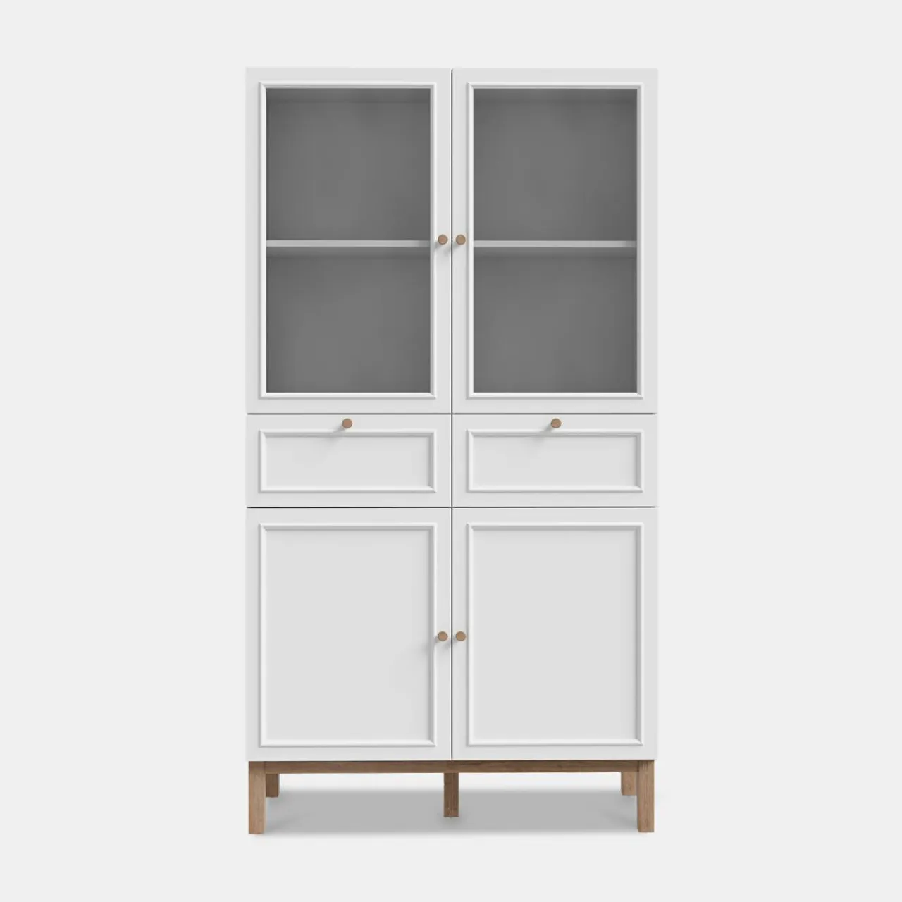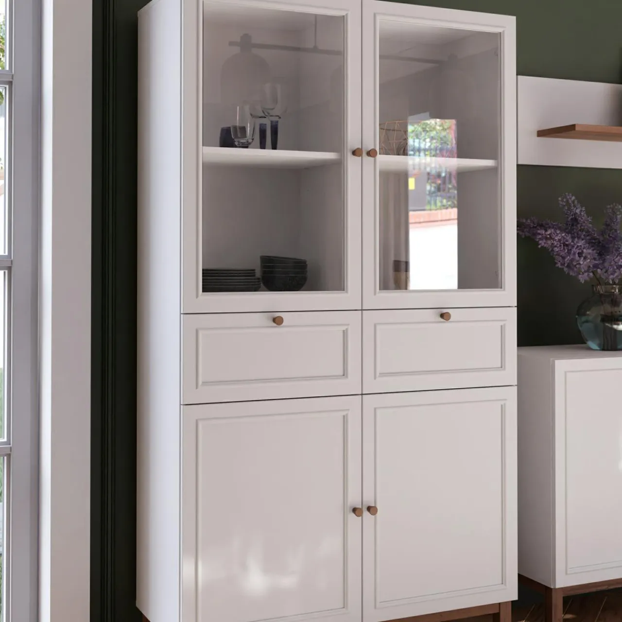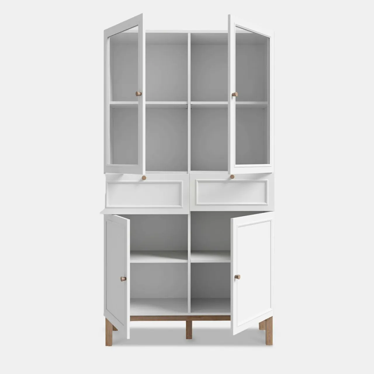 - Na 4 półkach w witrynie wyeksponujesz swoje ulubione pamiątki, dekoracje czy zdobione naczynia.