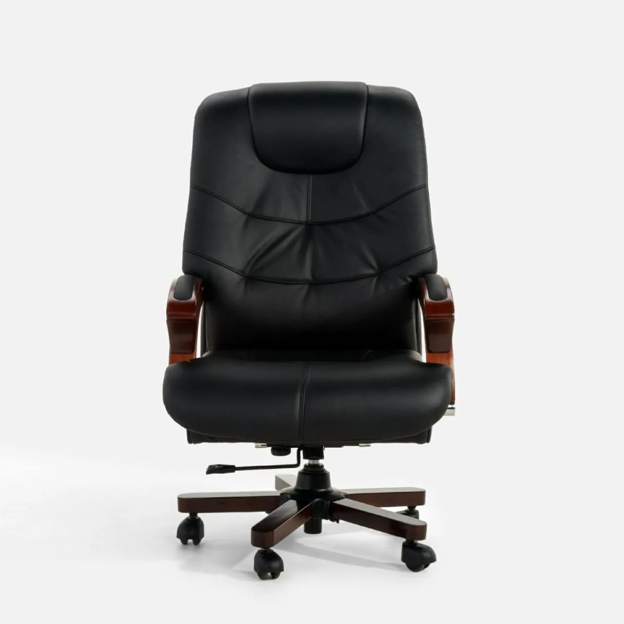 Fotel biurowy MONARCHE zapewni komfort podczas długich godzin pracy spędzonych przy biurku. Fotel łączy w sobie imitację ciemnego drewna oraz tapicerkę ze skóry naturalnej i eko-skóry w kolorze czarnym – dzięki temu prezentuje się on elegancko i będzie służył w gabinecie przez długie lata.
