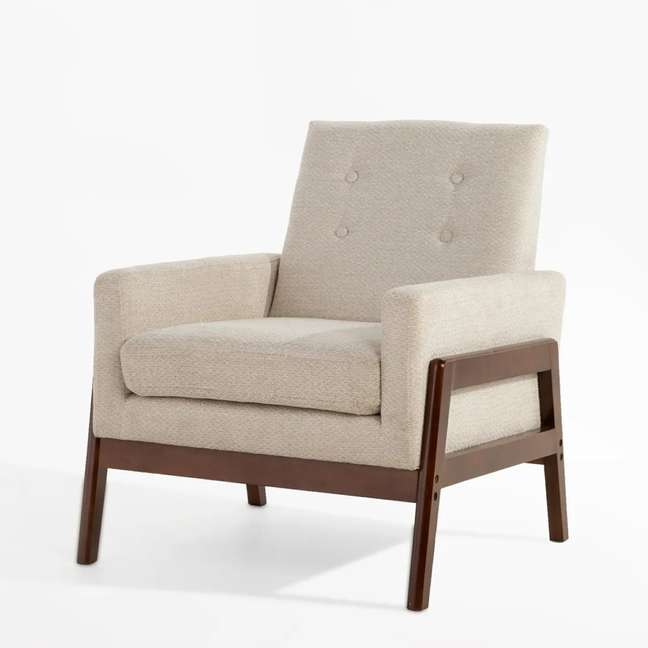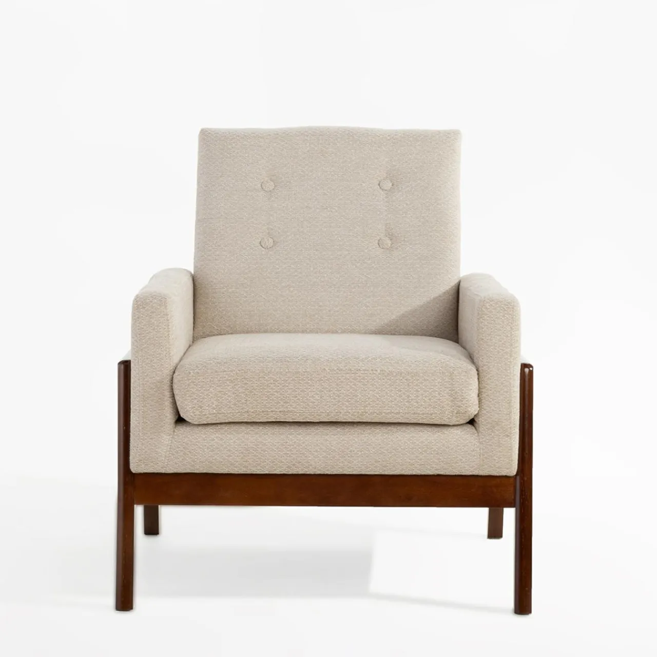 Prosta linia fotela MIATU sprawdzi się we wnętrzach w stylu vintage lub retro. Konstrukcja z sosnowego drewna i nogi z litego kauczukowca malowane na kolor orzech będą świetnie współgrać z jasnymi ścianami i dodatkami w wyrazistych kolorach.