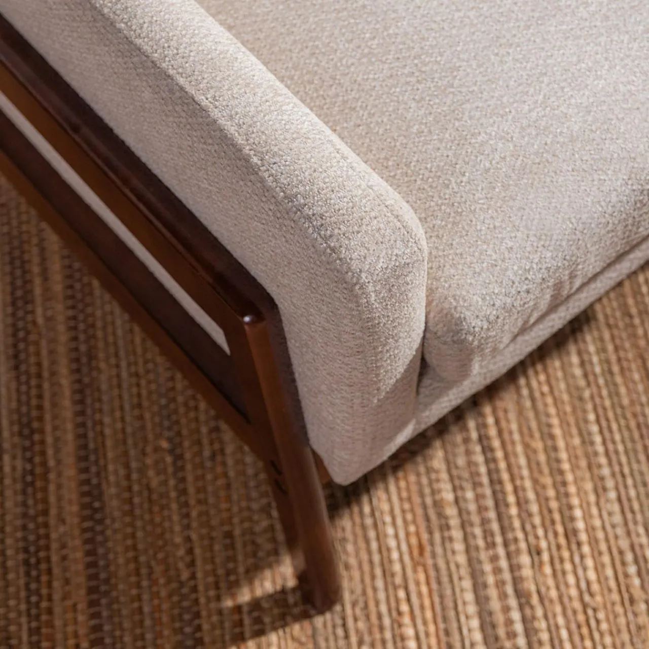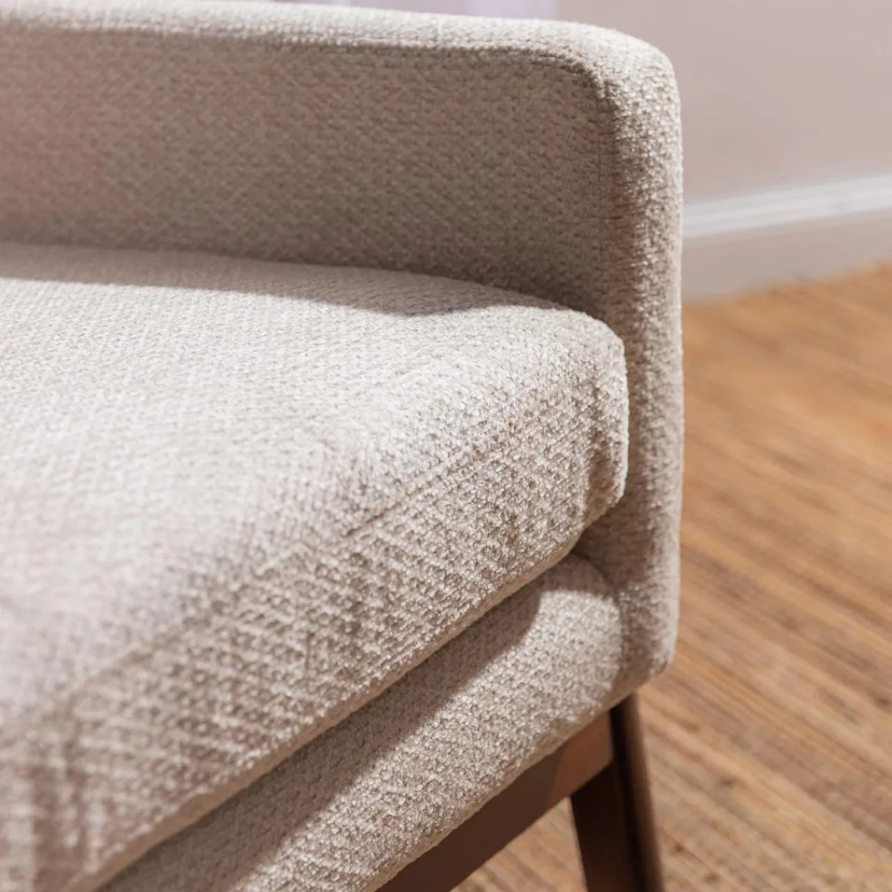 - Strukturalna tkanina w beżowym kolorze będzie pasować do dodatków w odcieniach bieli i beżu.