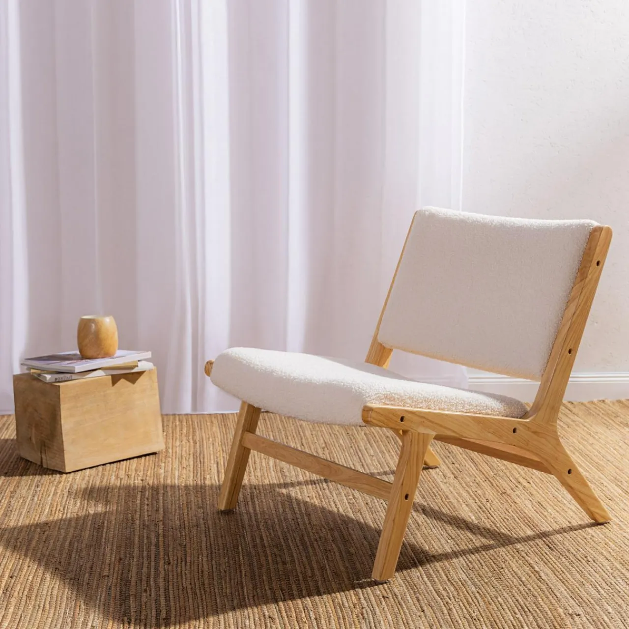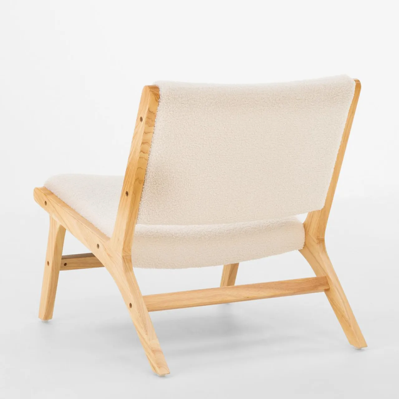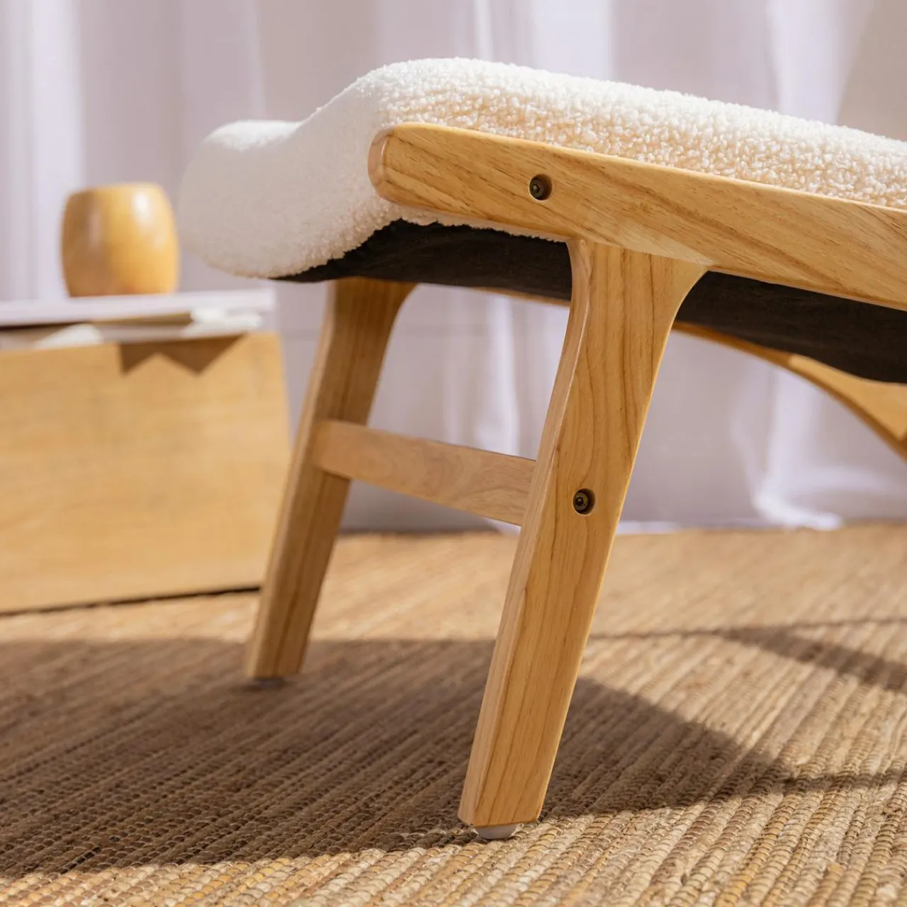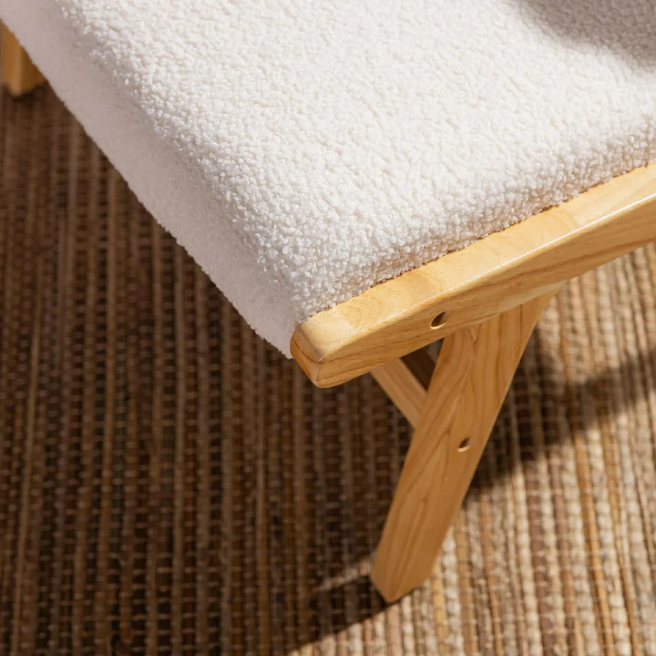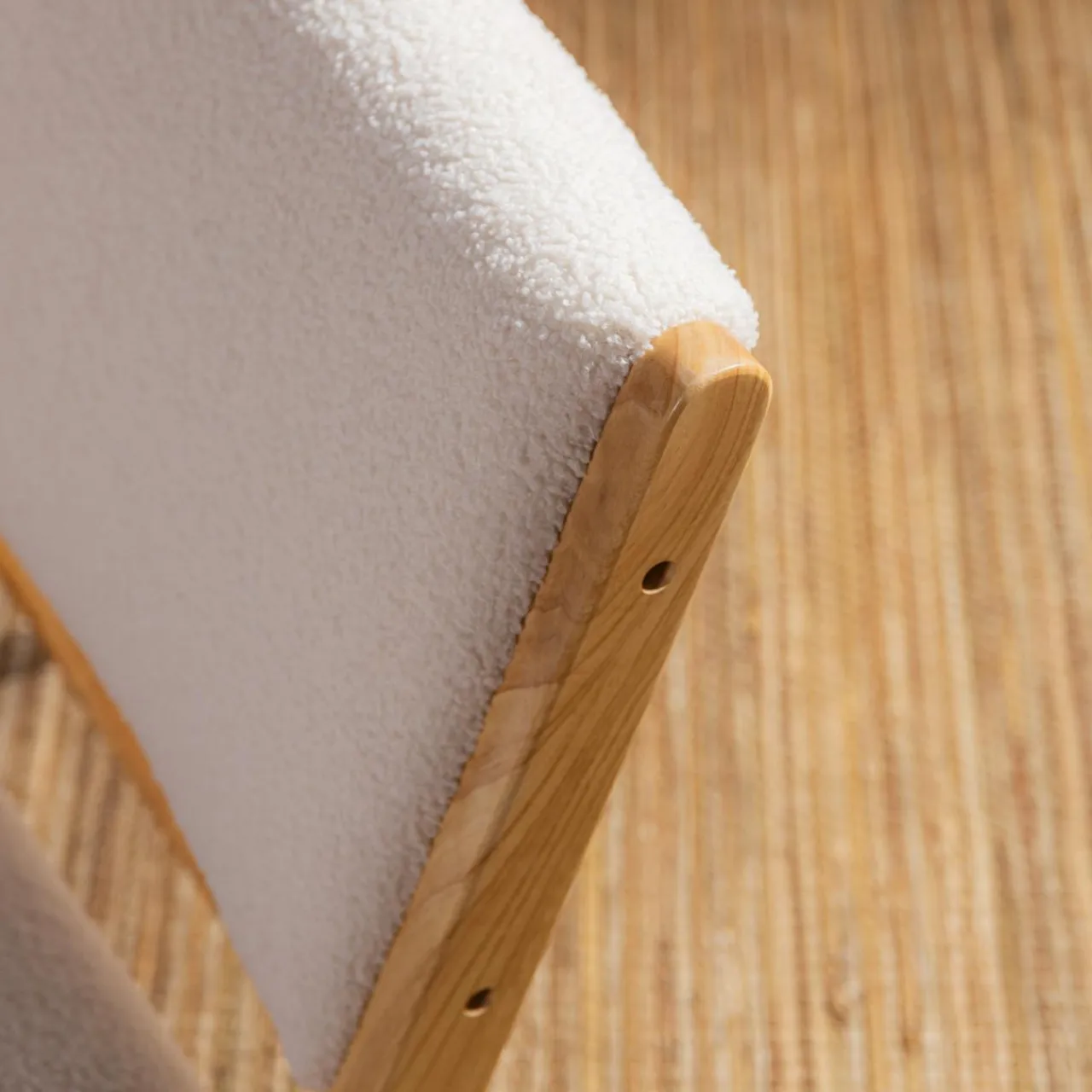 - Połączenie jasnego drewna i beżowej tkaniny boucle będzie pasować zarówno do skandynawskiego wnętrza, jak i tego urządzonego w stylu nowoczesnym.
