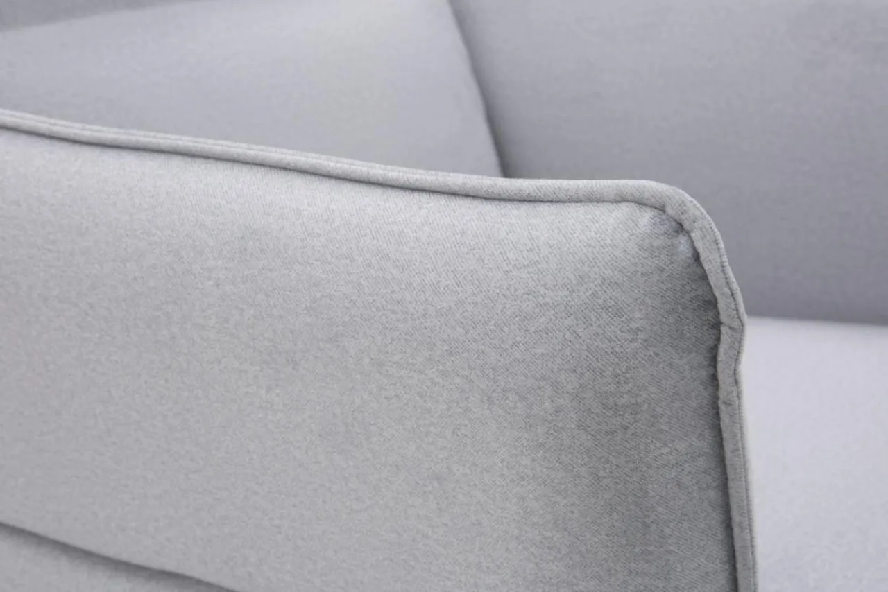 - Tapicerka została wykonana z miękkiej w dotyku tkaniny w jasnoszarym kolorze, przypominającej welur.
