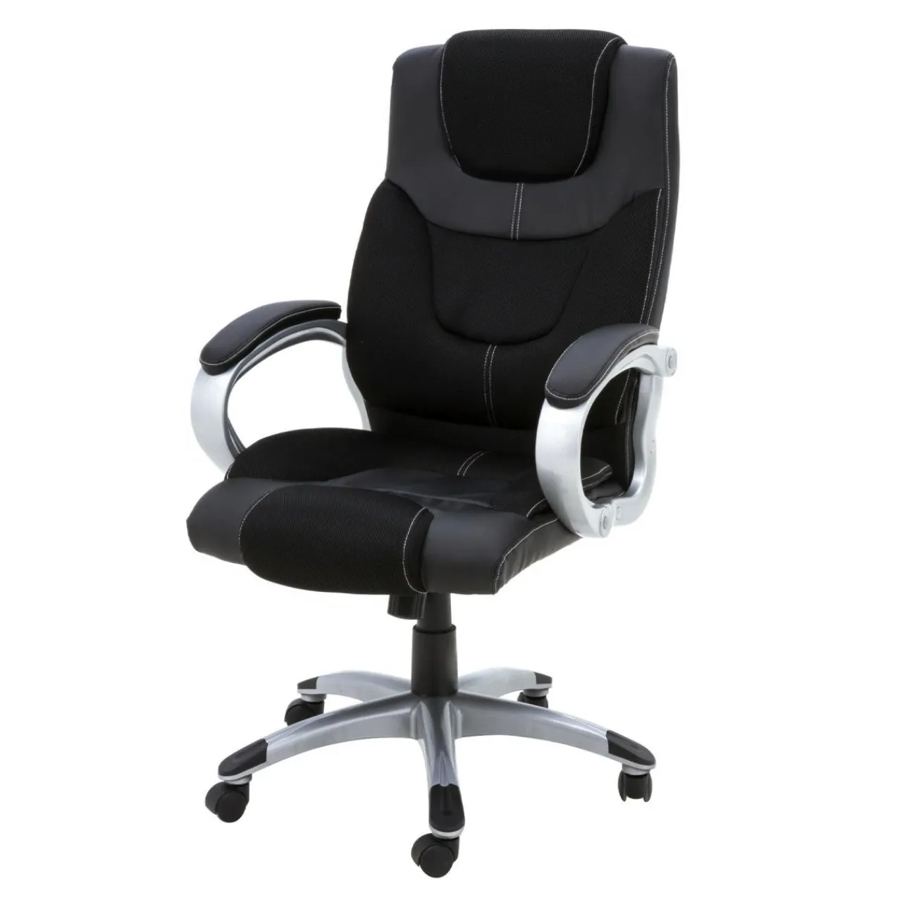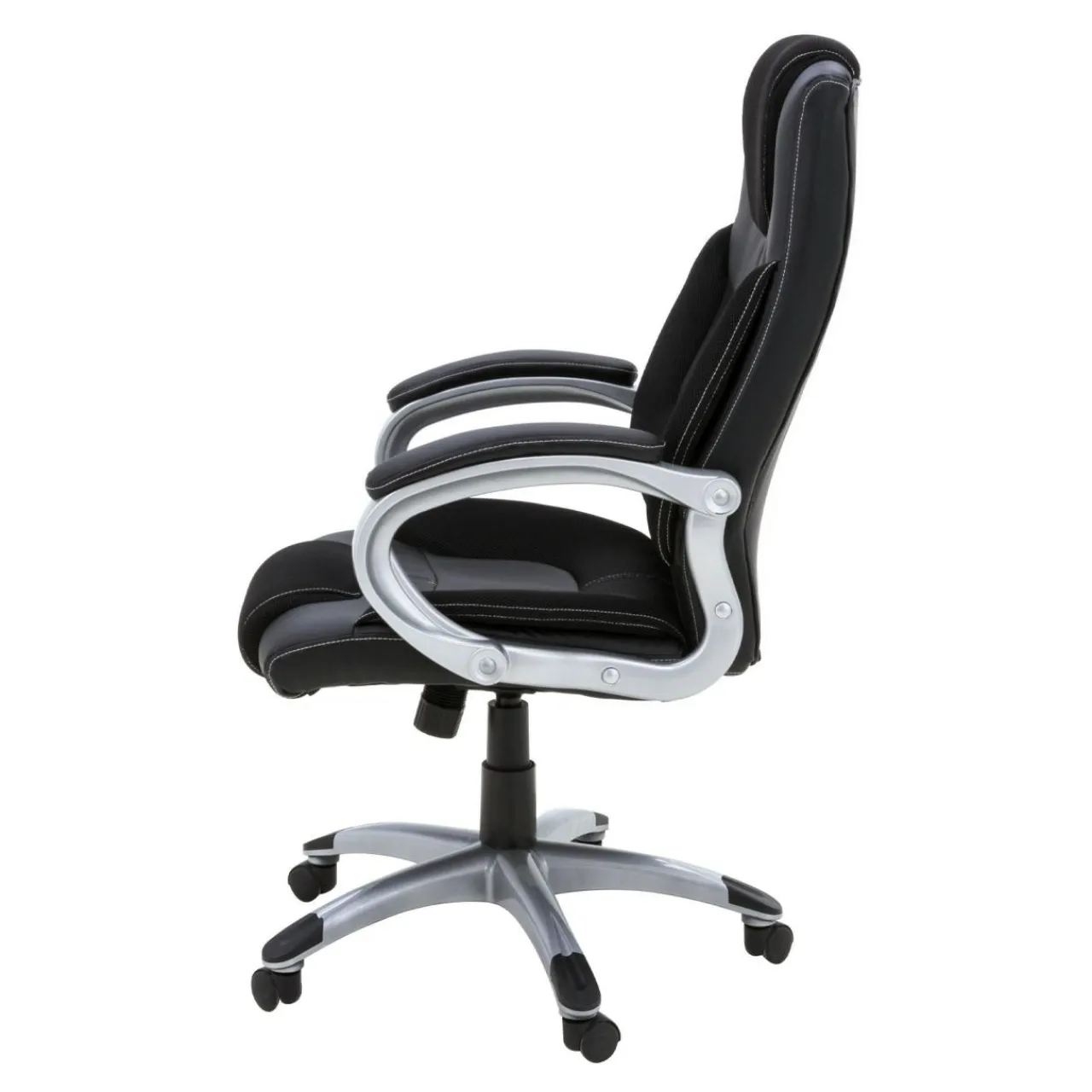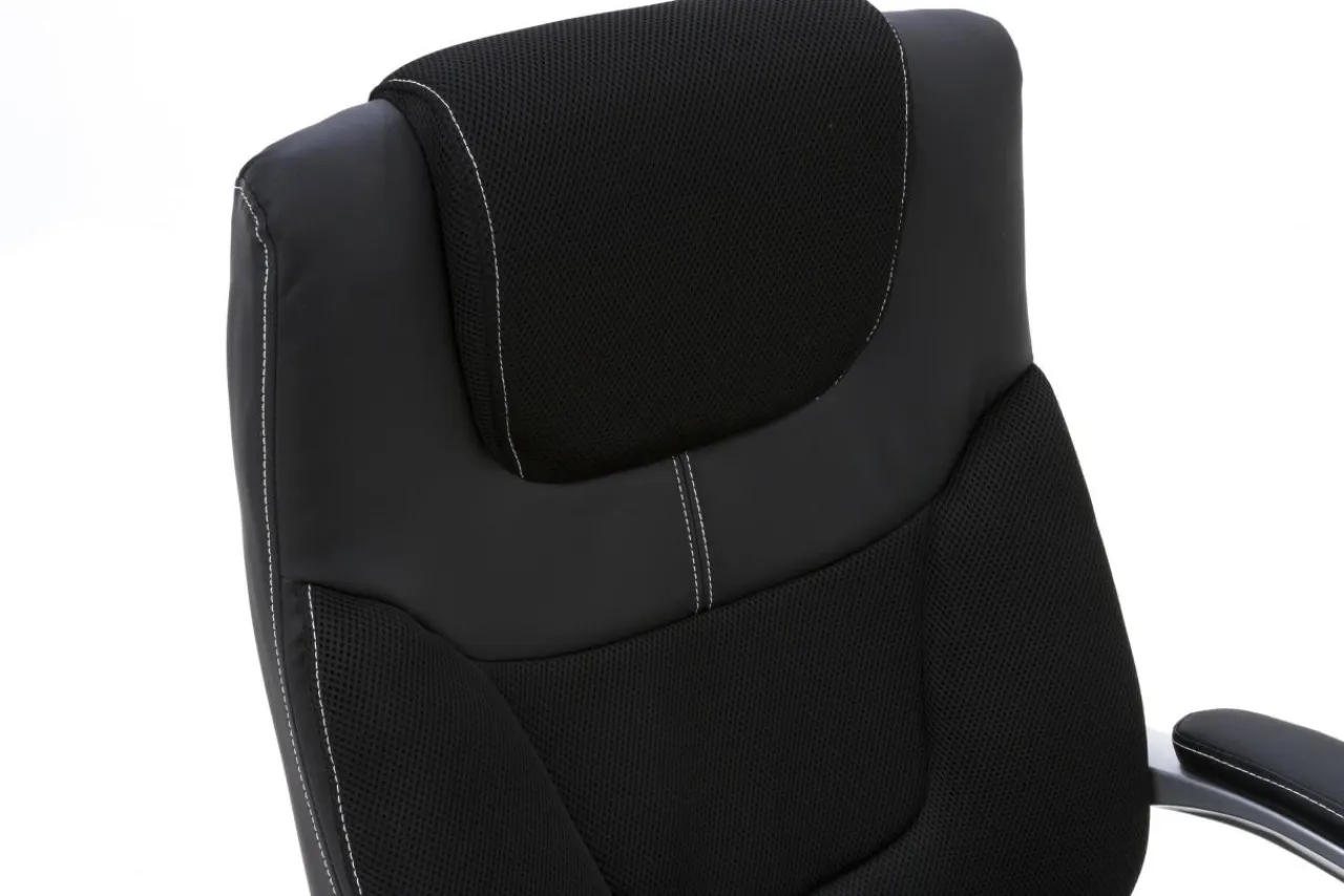 Eleganckie podłokietniki w kolorze „chrom”, wykończone czarną skórą ekologiczną, dają stabilne i komfortowe podparcie rąk podczas pracy przy biurku.