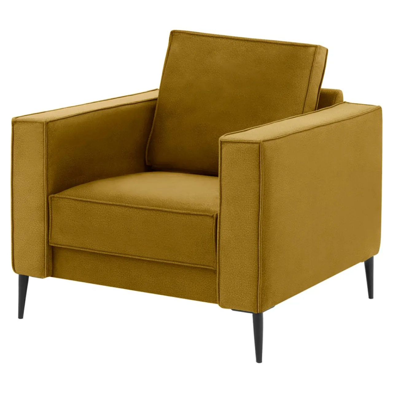 - Tapicerka została wykonana z miękkiej w dotyku, welurowej tkaniny w musztardowym kolorze.