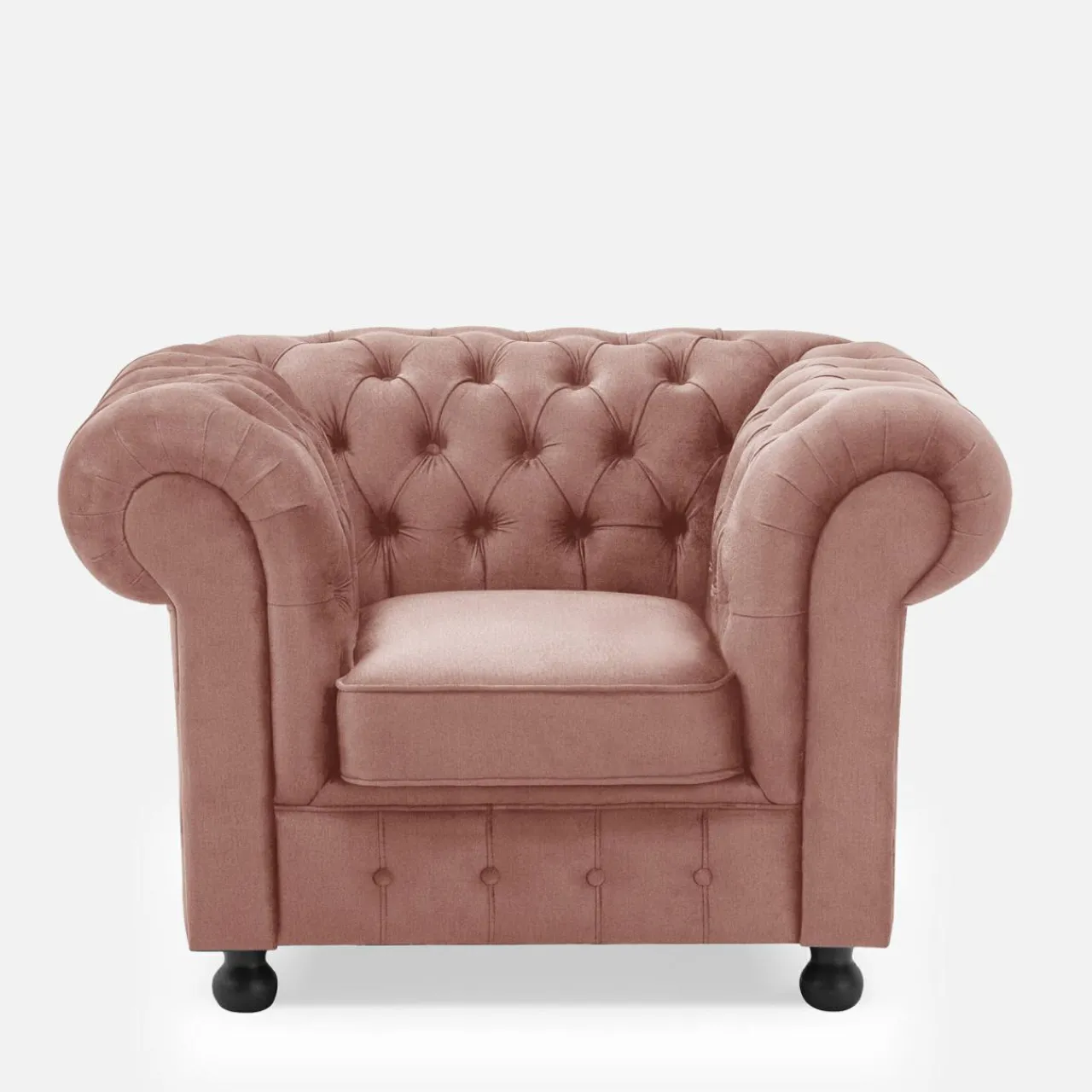 - Wewnętrzną część oparcia i wywiniętych na zewnątrz podłokietników pokryto pikowaniem oraz ozdobnymi guzikami w kolorze tapicerki.