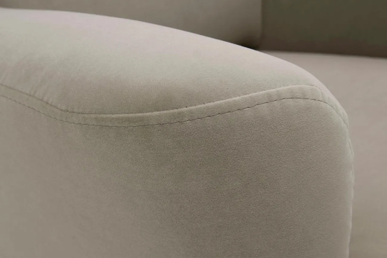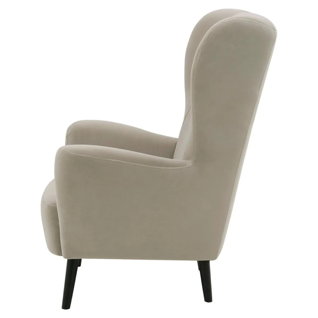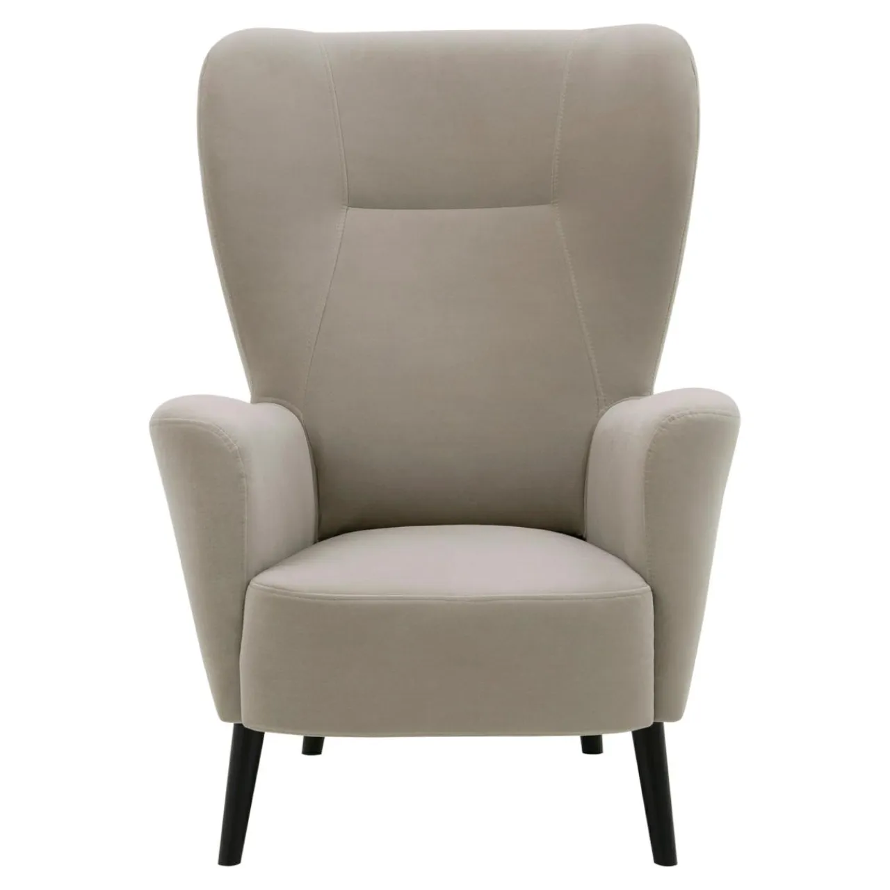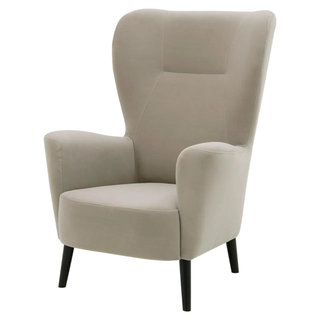 Klasyczna stylizacja fotela kojarzy się z wygodą i komfortem, a tkanina w szaro-beżowym odcieniu połączona z czarnymi nóżkami podkreśla jego elegancję i uniwersalność mebla.