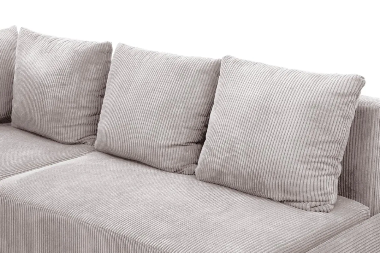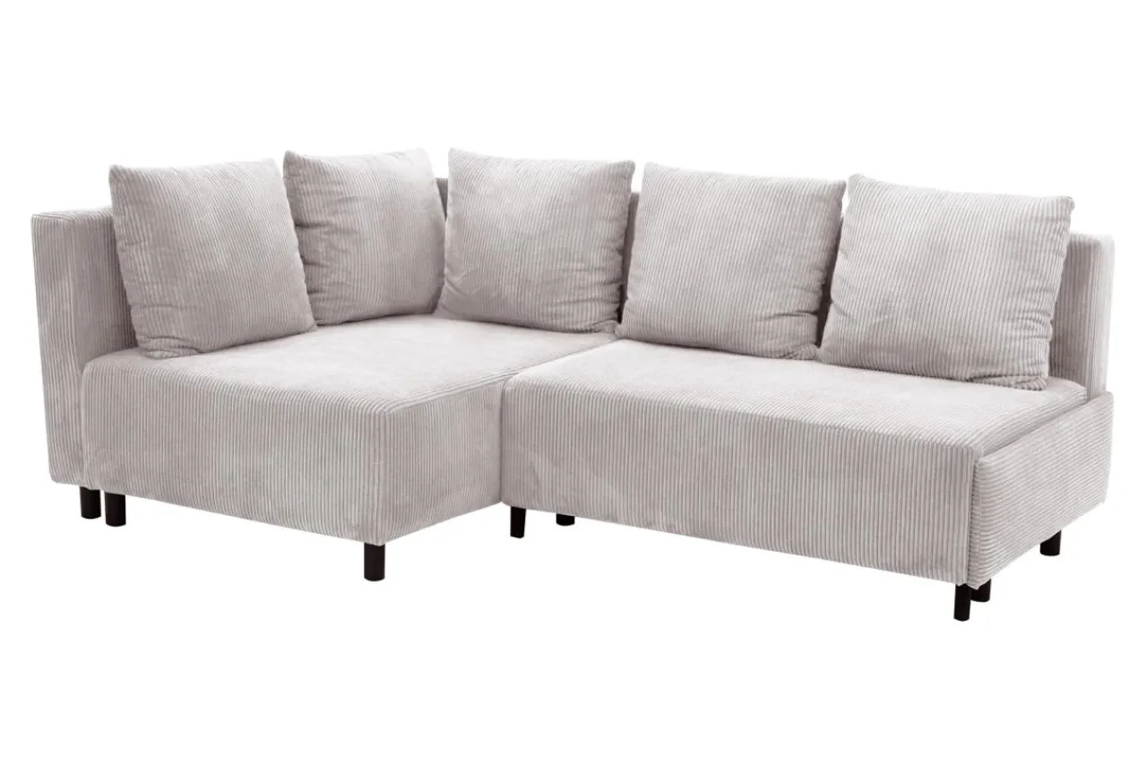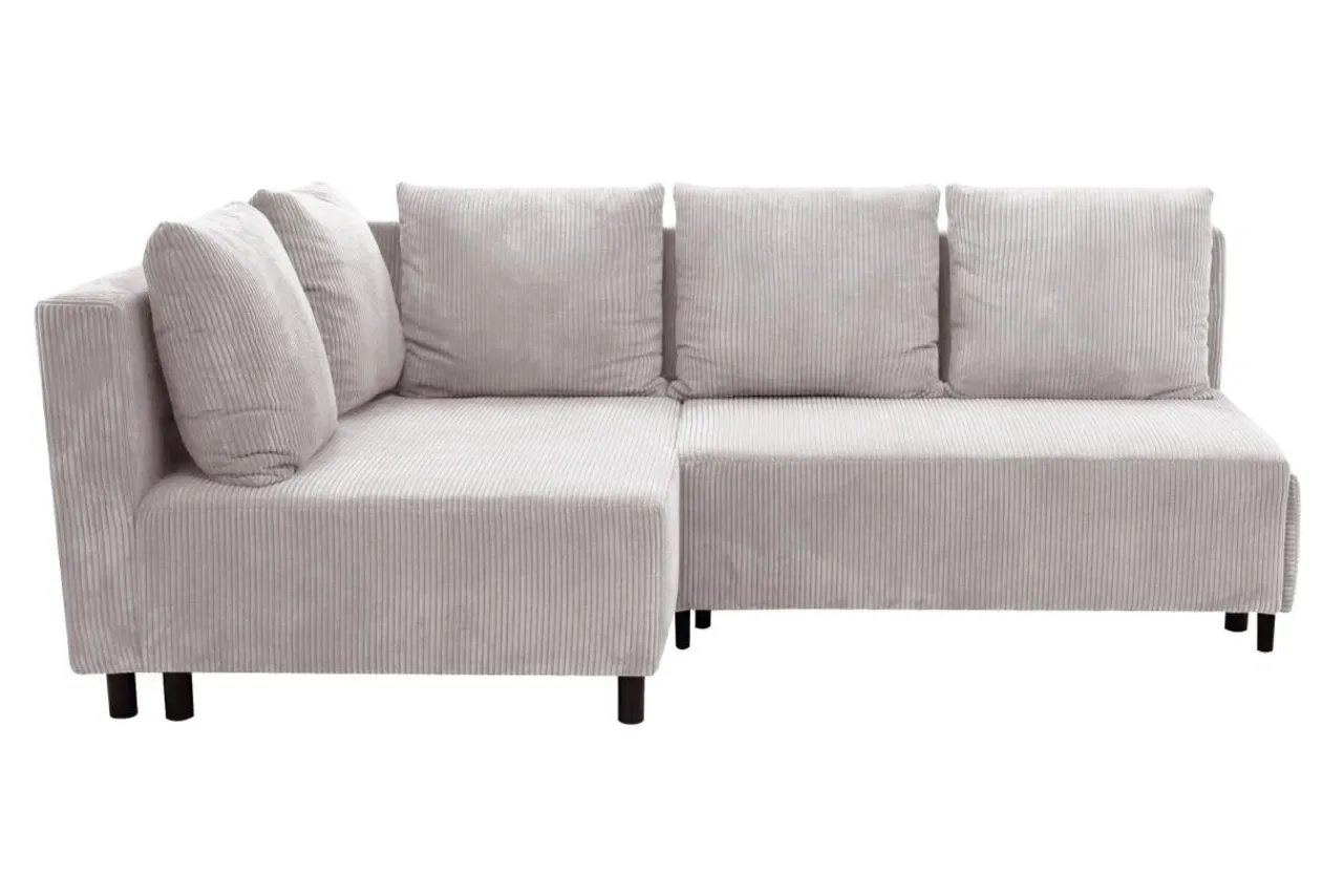 Narożnik w jasnoszarym kolorze przyciąga wzrok miękką, sztruksową tapicerką.