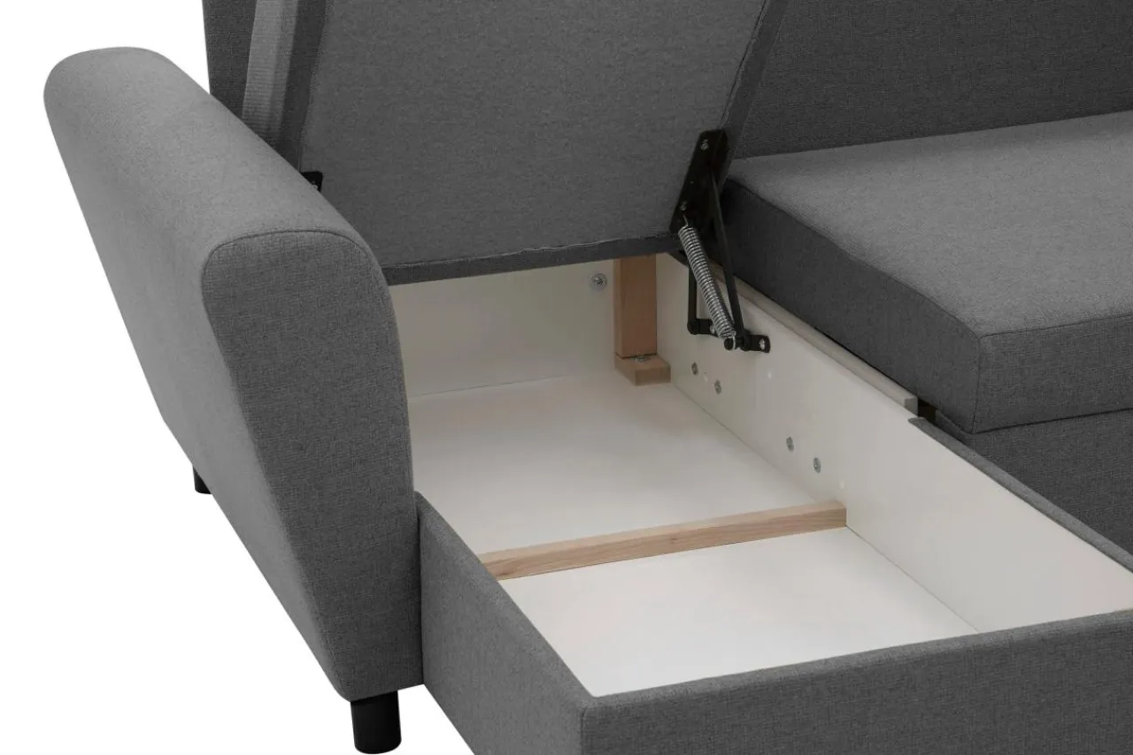 - Narożnik posiada aż 2 pojemniki, które możesz wykorzystać zarówno jako schowki na pościel, jak i przestrzeń do przechowywania na drobiazgi.