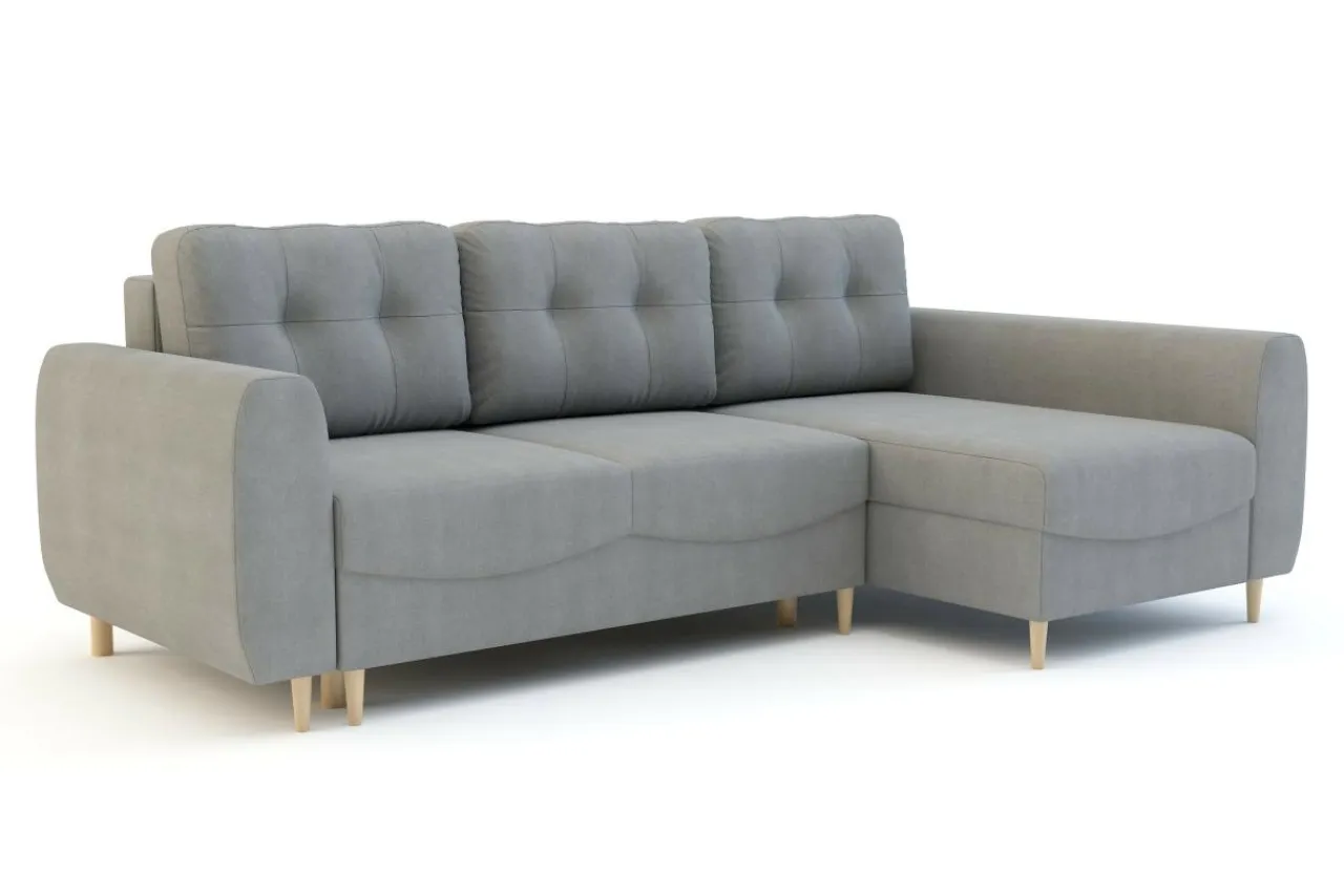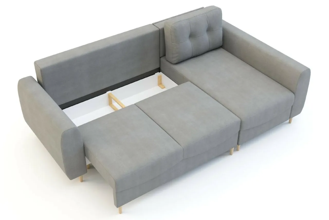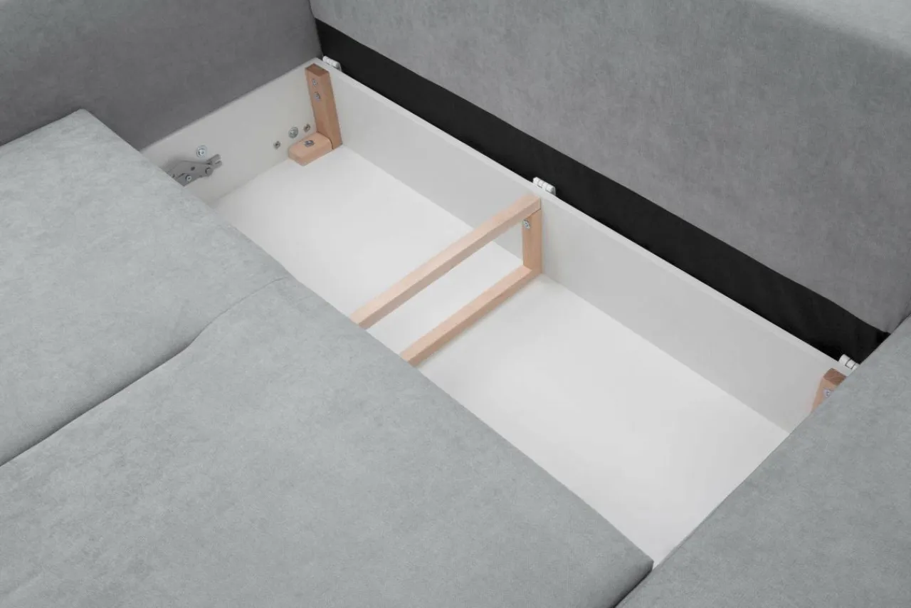 Aby przenocować gościa, wystarczy wysunąć siedzisko i złożyć oparcie. Z pojemnika, znajdującego się pod siedziskiem możesz korzystać w trakcie rozkładania narożnika.