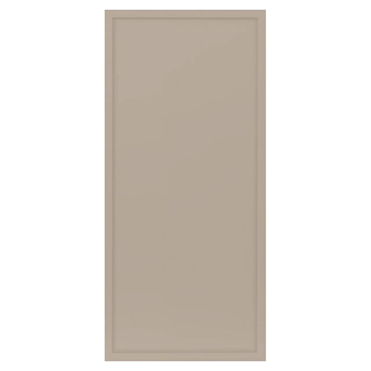 Front drzwi został wykończony folią PVC w szarym kolorze. Jego kolorystyka rozjaśnia optycznie pomieszczenie i doskonale sprawdza się w połączeniu z wnętrzami utrzymanymi w ciepłych barwach z drewnianymi meblami w naturalnych kolorach.