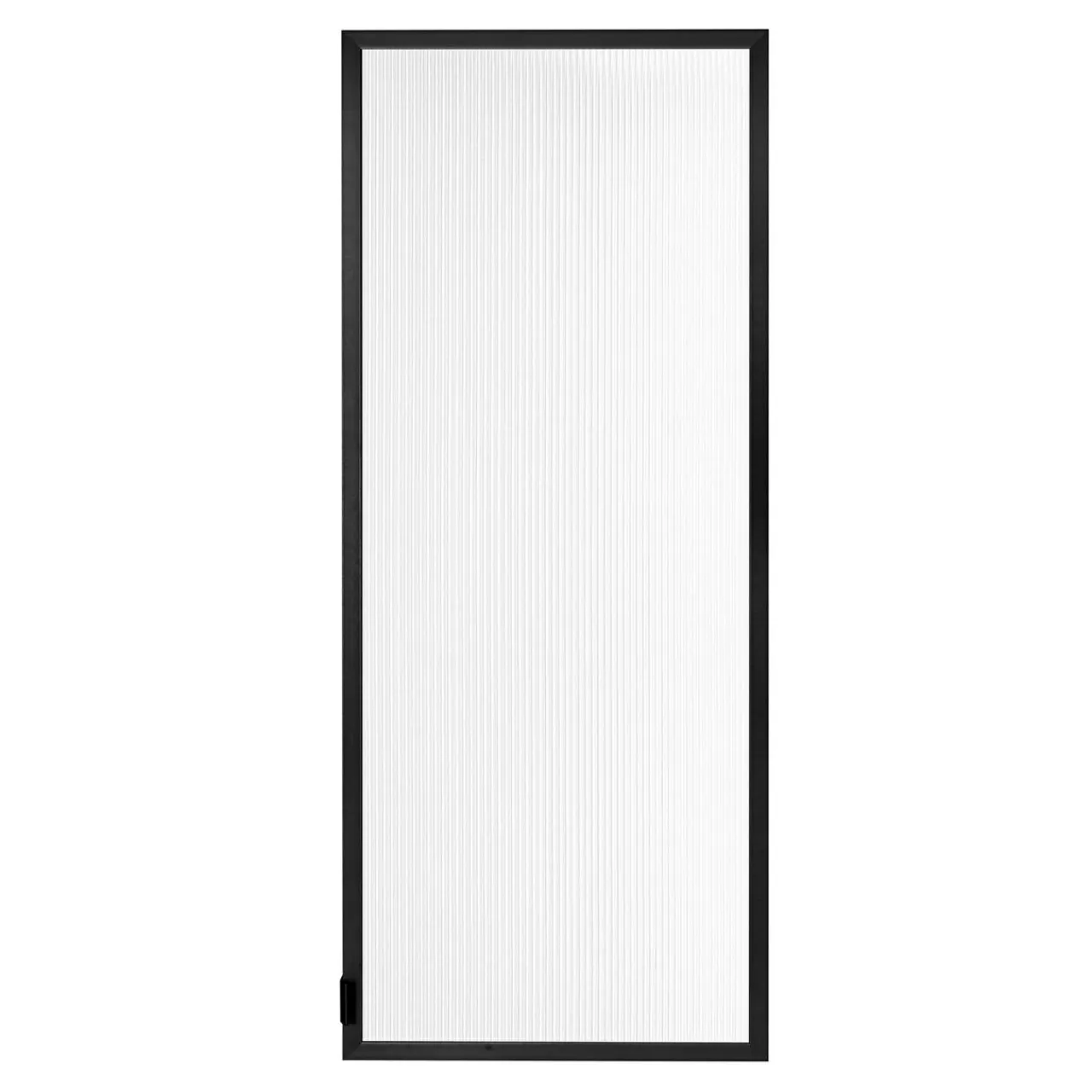 Ryflowana powierzchnia szkła hartowanego wprowadzi do wnętrza ciekawą grę światła i cienia. Czarna ramka frontu sprawdzi się w industrialnej aranżacji wnętrza.