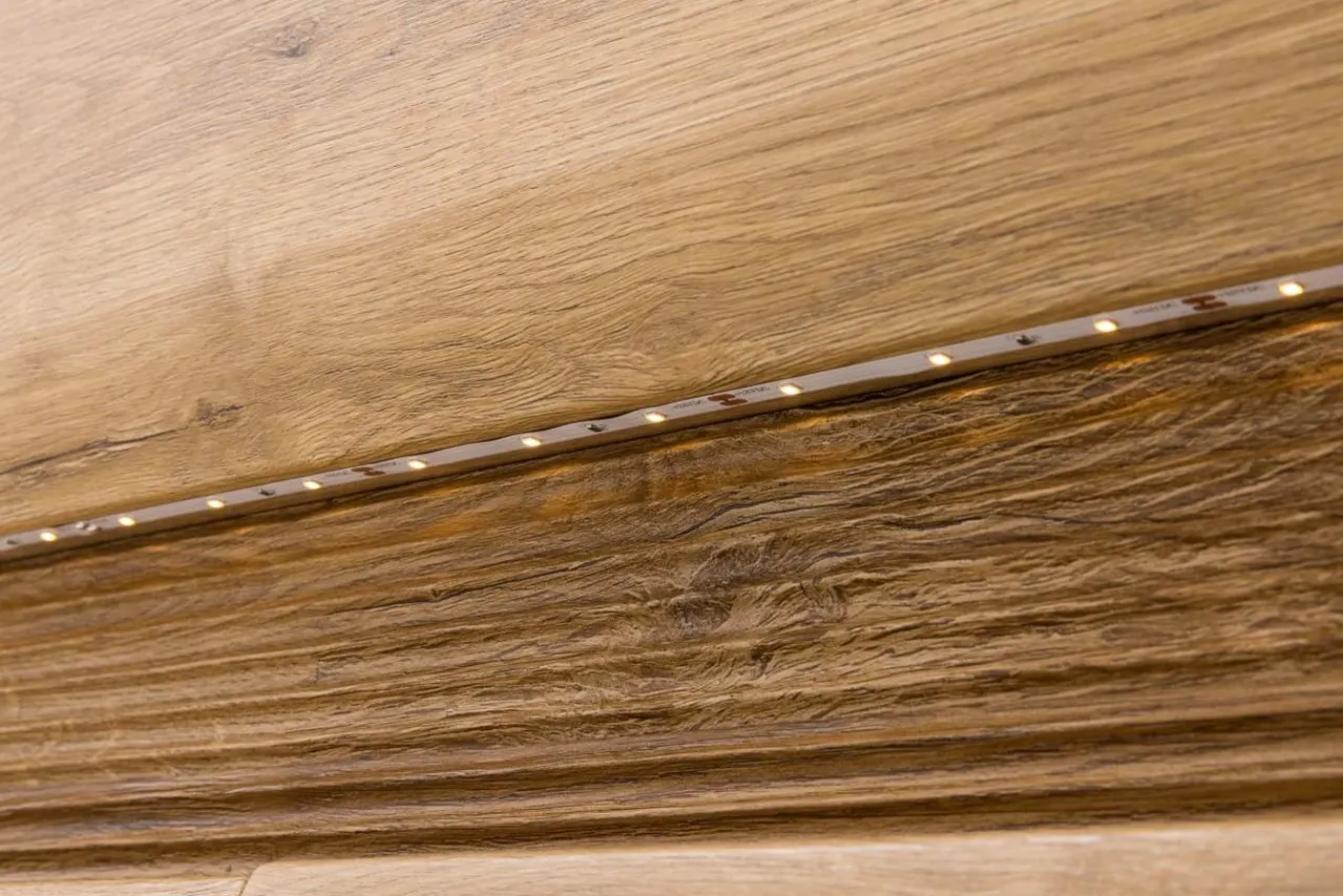 Ciepły odcień dębu dodaje pomieszczeniu przytulności, którą dodatkowo wzmaga jeszcze oświetlenie LED o ciepłej, białej barwie. Brak widocznych uchwytów i delikatne żłobienia na froncie dodają meblom elegancji.