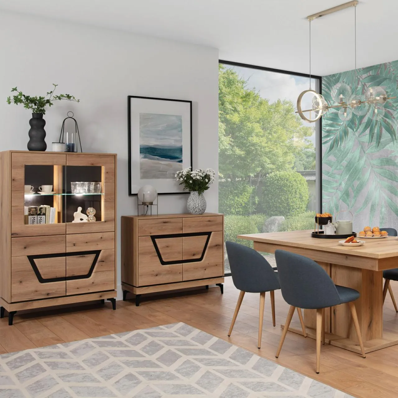 Jasne meble do salonu – kontrast rysunku drewna i czarnego dekoru