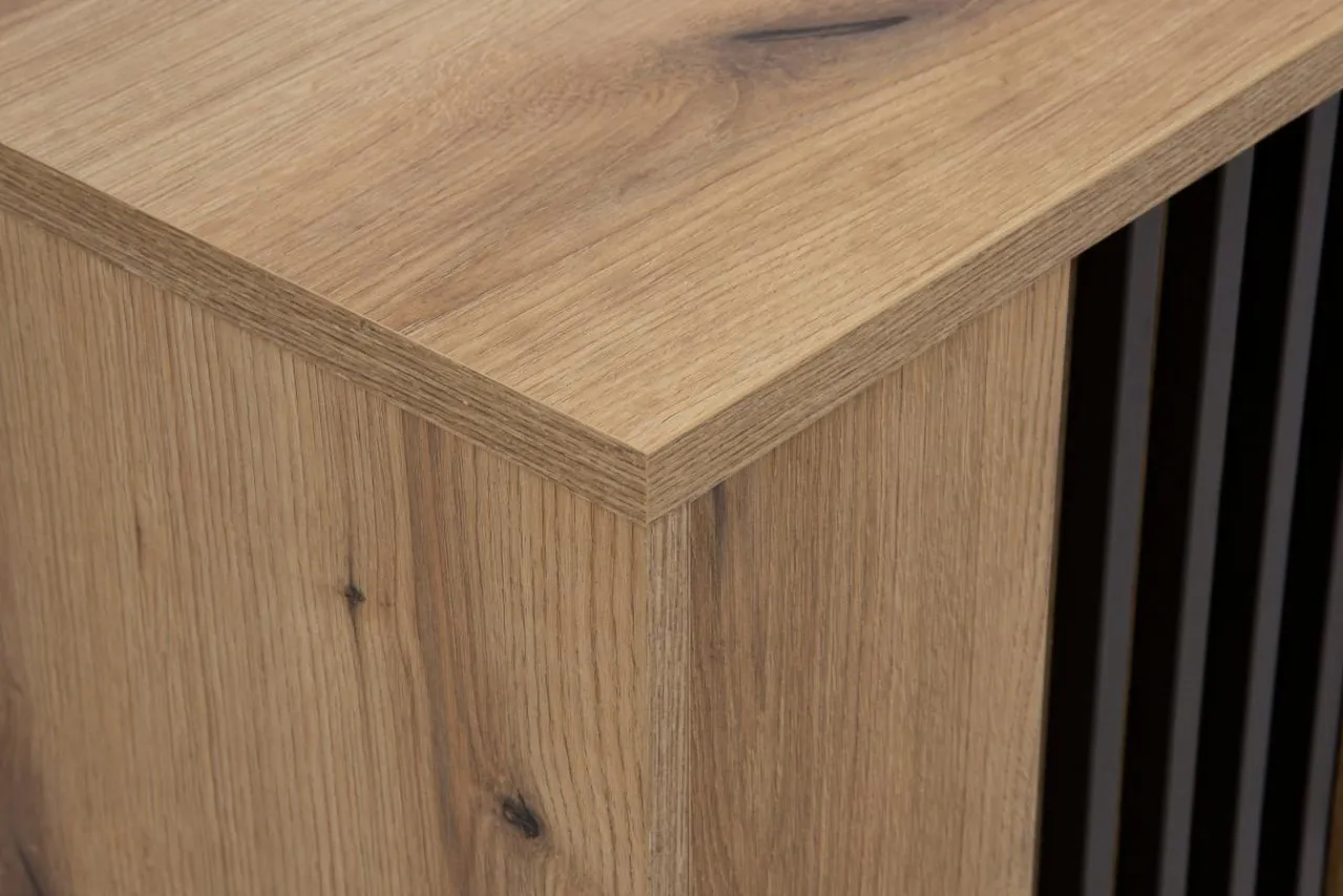 Połączenie laminatu imitującego drewno z czarnymi nóżkami i lamelami na froncie sprawia, że mebel odnajdzie się we wnętrzach urządzonych w stylu nowoczesnym i japandi.