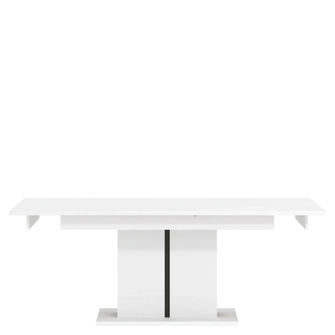 - Korpus, blat oraz kolumnowa podstawa stołu są wykonane z płyty wiórowej i wykończone matowym laminatem w klasycznej bieli przełamanej czarną wstawką wzdłuż kolumny;