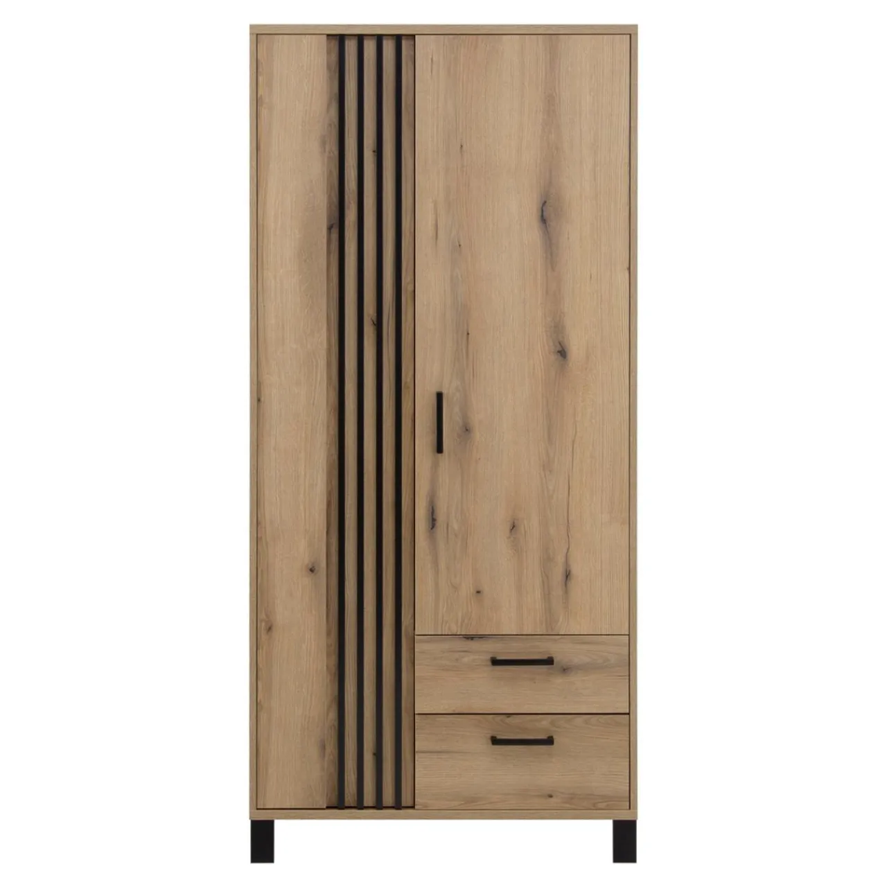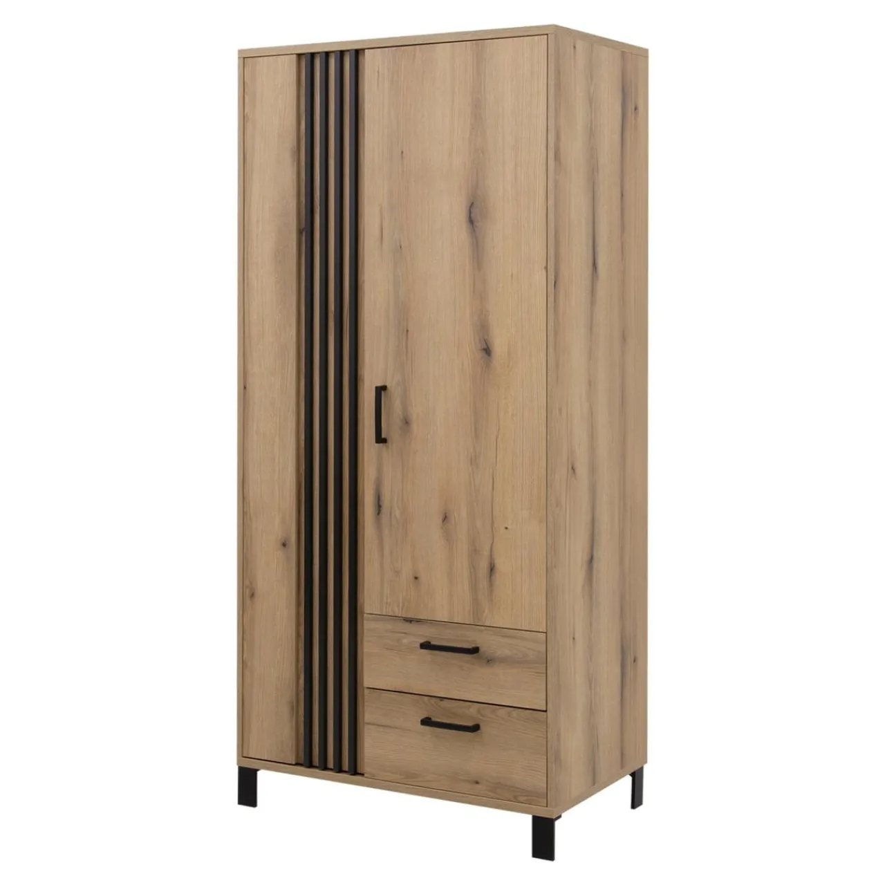 Kolekcja NOEL to połączenie laminatu imitującego drewno z czarnymi nóżkami i lamelami na froncie. To wszystko sprawia, że mebel odnajdzie się we wnętrzach urządzonych w stylu nowoczesnym i japandi.