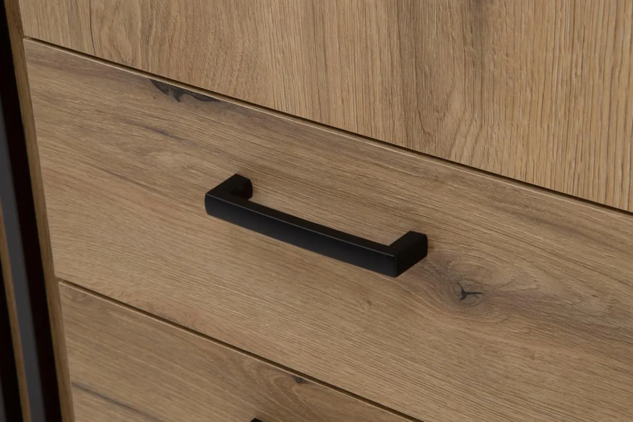 - Mebel wykonano z płyty wiórowej o grubości 16 mm i pokryto laminatem w kolorze dąb evoke.