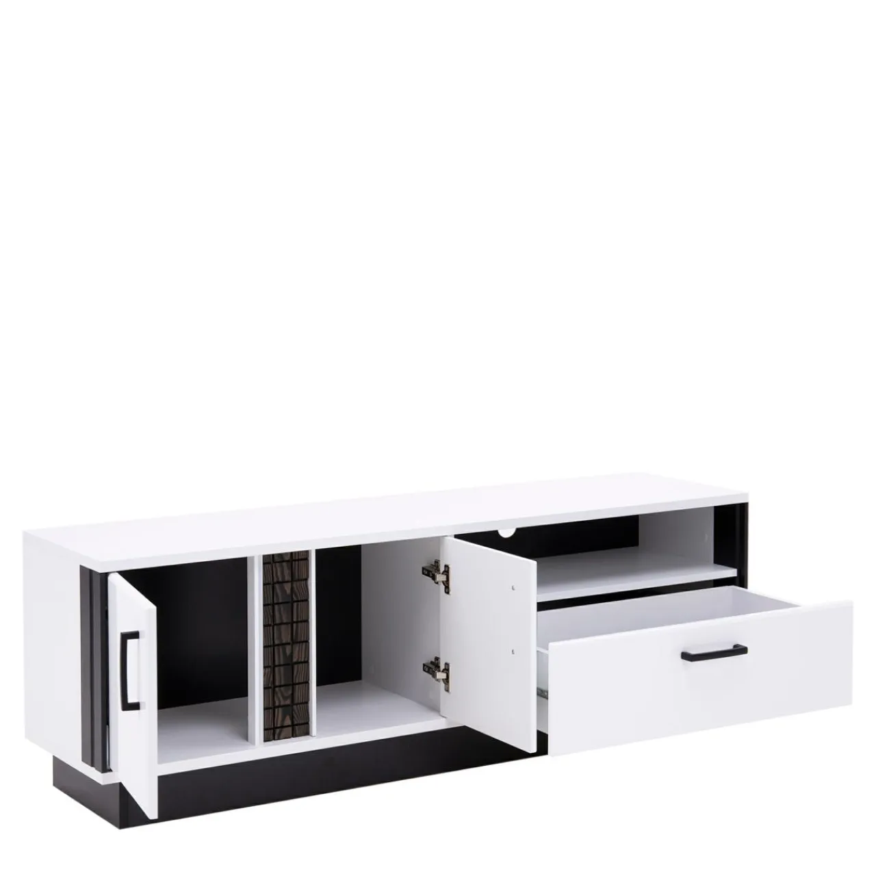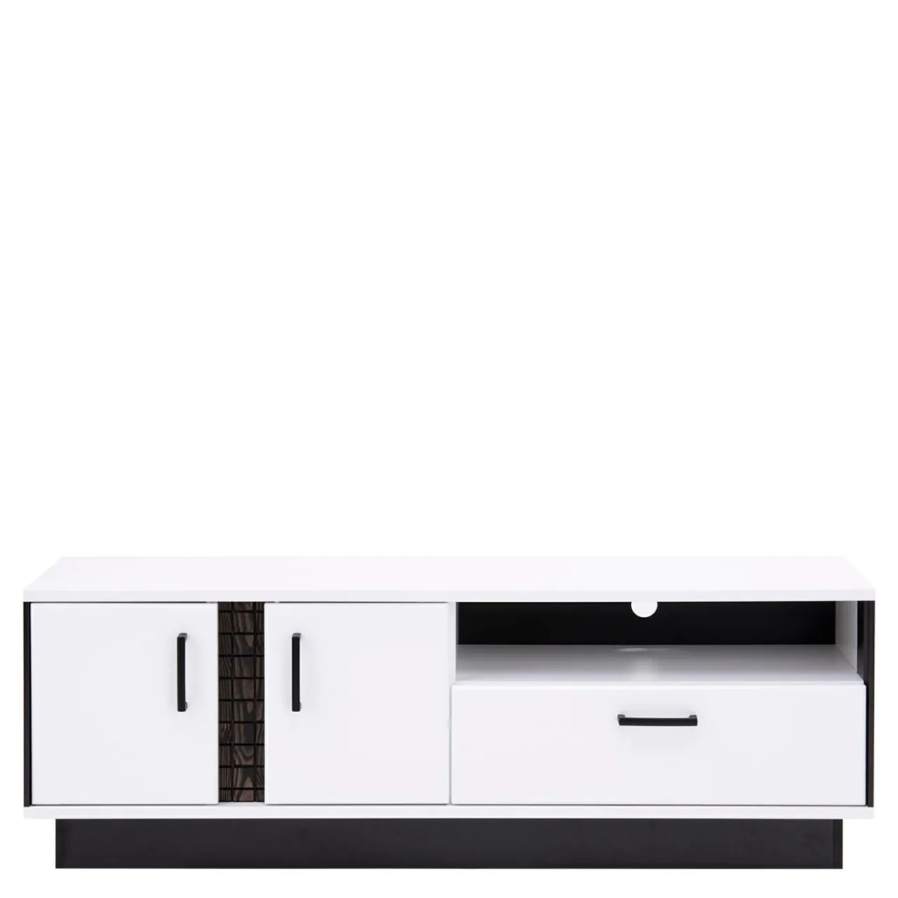 - Pod blatem znajduje się otwarta wnęka, w której można umieścić dekodery i inne urządzenia elektroniczne. Z tyłu wnęki, na optymalnej wysokości jest umieszczony otwór, przez który można przełożyć kable, by podłączyć sprzęt do gniazdka;