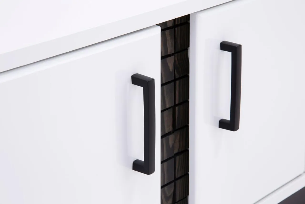 - Korpus mebla oraz półki są wykonane z połączenia płyty wiórowej o grubości 16 mm i drewna sosnowego o grubości 20 mm. Są wykończone matowym laminatem w klasycznej bieli przełamanej czarnymi wstawkami kolorystycznymi oraz wyjątkowo zdobnym dekorem;