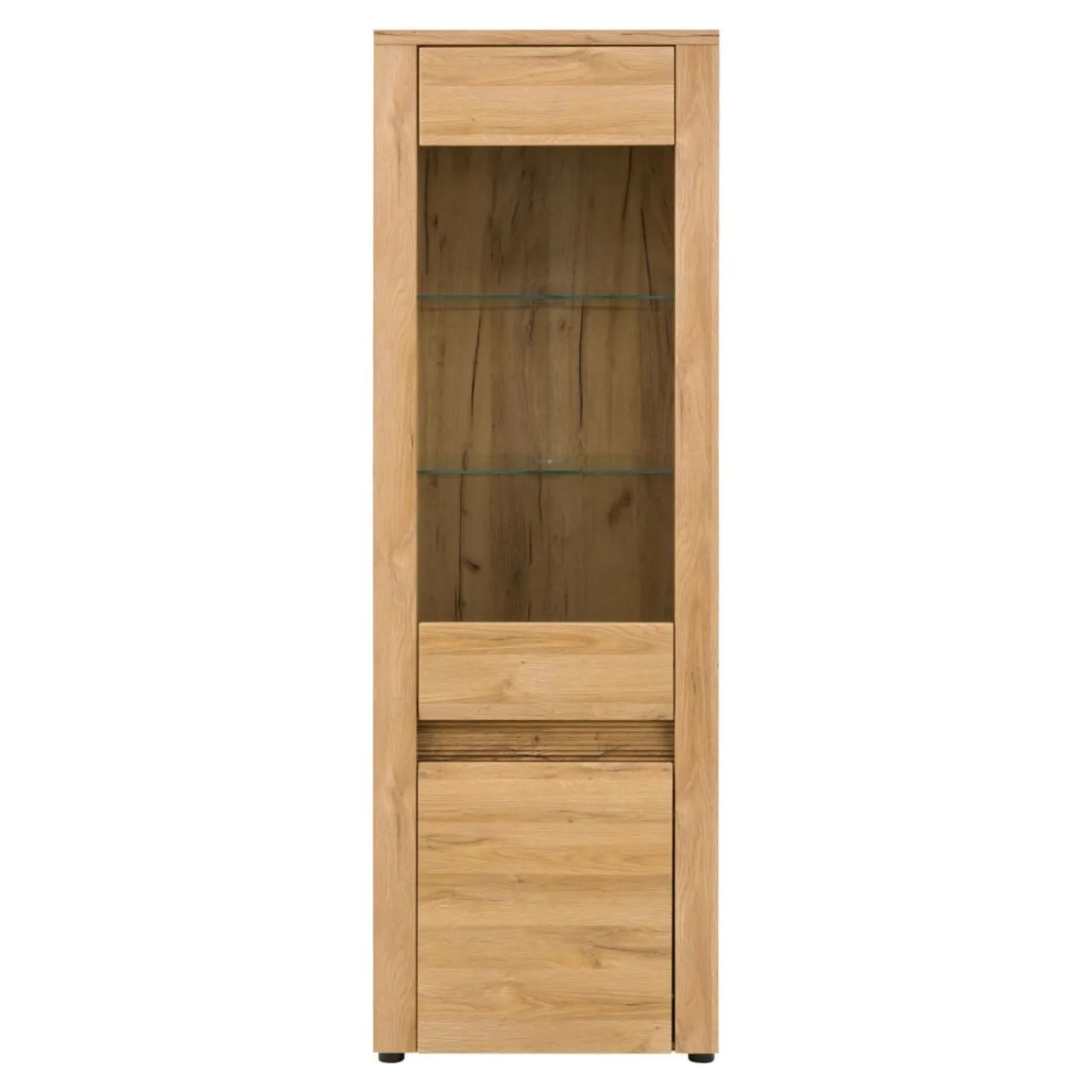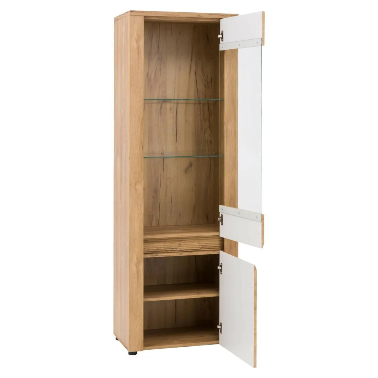 Wnętrze witryny kryje praktyczne wnęki ukryte za pełnymi drzwiami oraz podświetlane półki za szklanymi drzwiami, idealne do wyeksponowania porcelany lub innych dodatków.