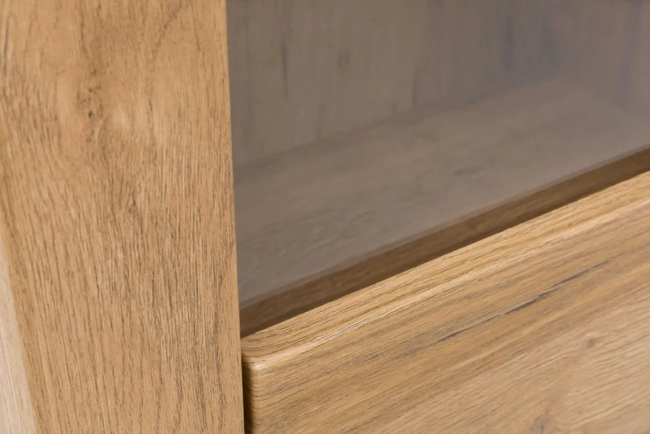 Witryna z serii SANDY to nowoczesny mebel do zastosowania w salonie. Dzięki szerokim listwom wzdłuż boków szafki oraz krótkim, nieregulowanym nóżkom meble z kolekcji SANDY sprawiają wrażenie solidnych i masywnych.