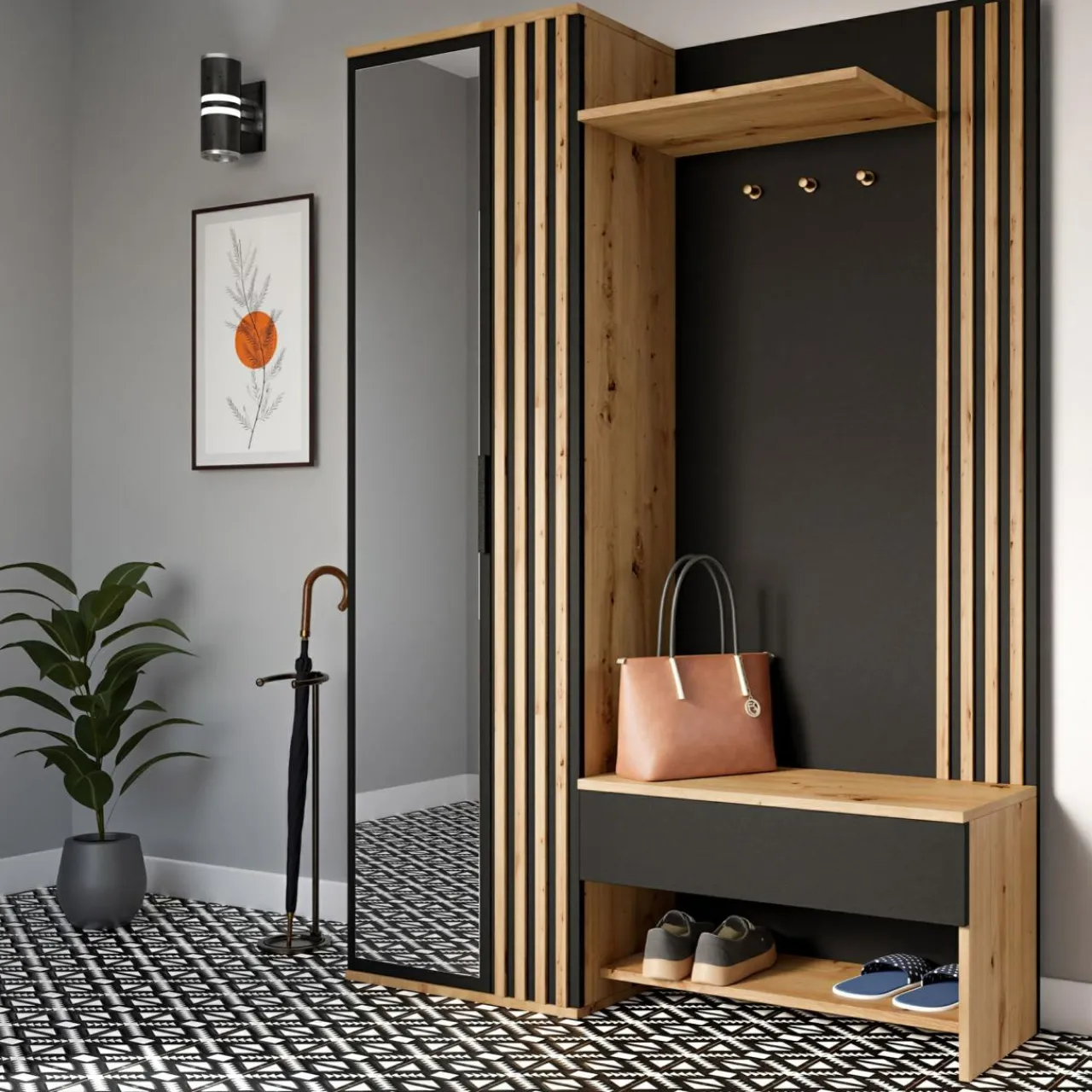 Dekoracyjne lamele w kolorze dąb wotan sprawiają, że przedpokoju nabiera minimalistycznego stylu z nutką japandi. Długie i cienkie lamele wydłużają optycznie ścianę, na której znajduje się mebel.