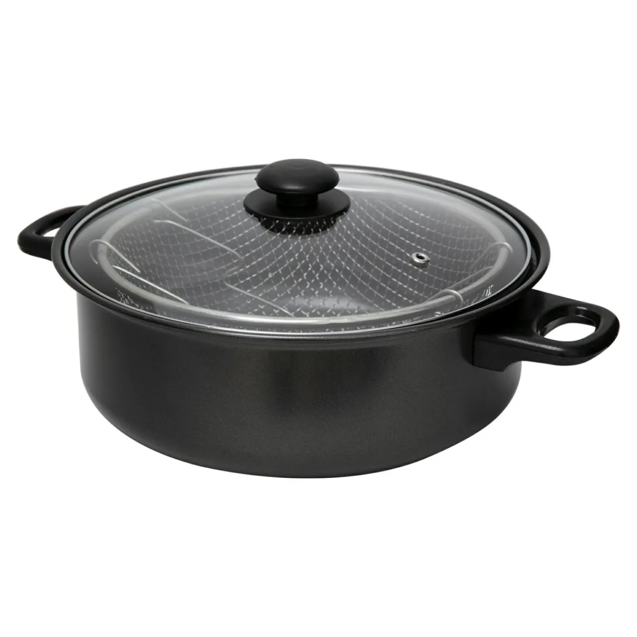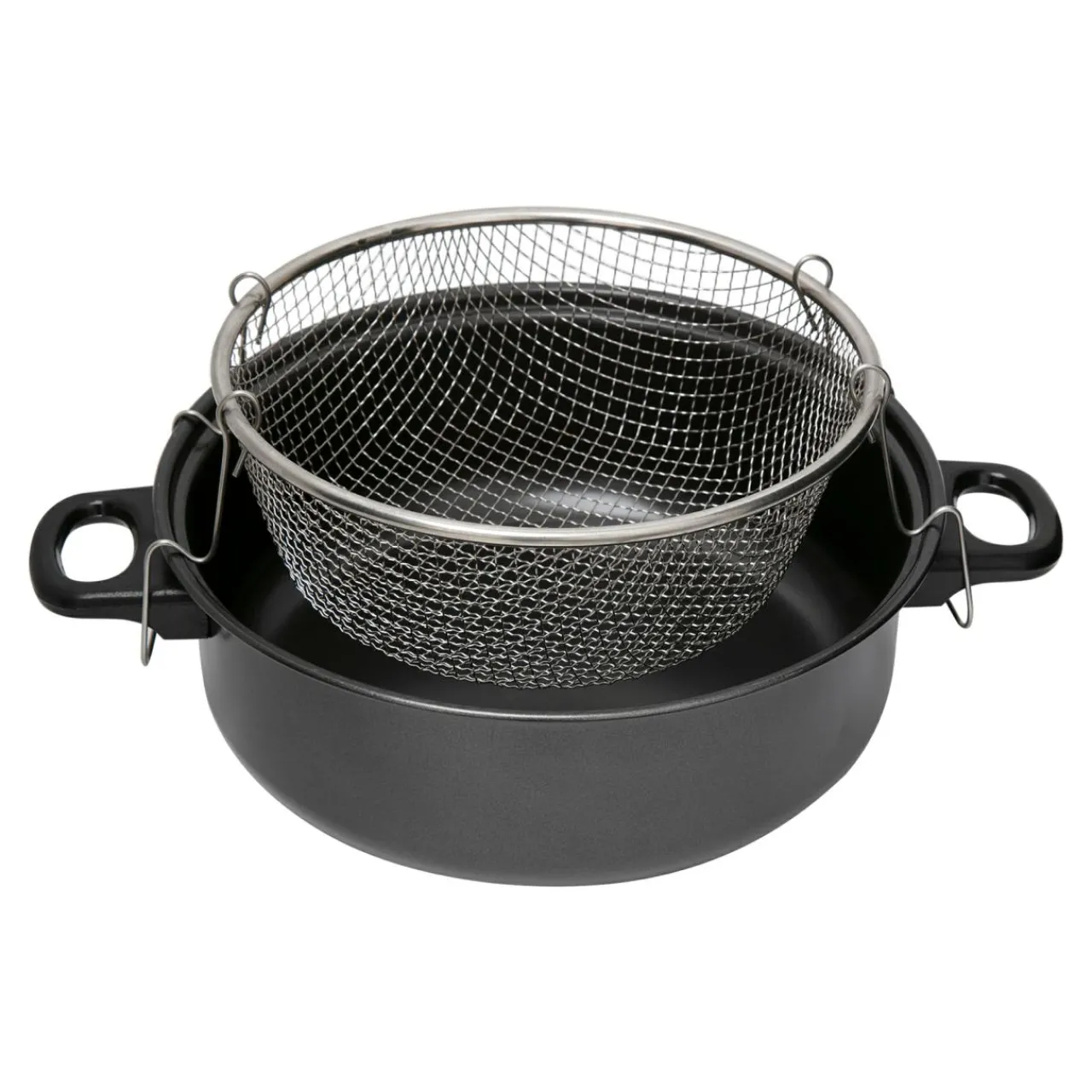 Garnek do smażenia na głębokim oleju z koszyczkiem i szklaną pokrywką ułatwi Ci smażenie w głębokim oleju.