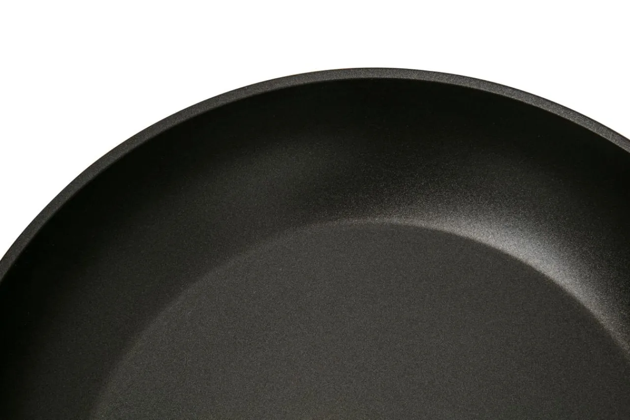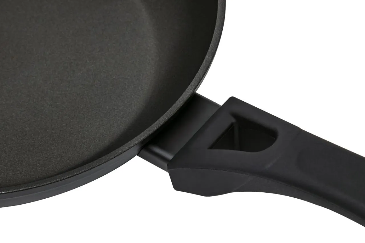 Patelnia jest wykonana z kutego aluminium, jej rączka to bakelit + miękki w dotyku tworzywo, które się nie nagrzewa.