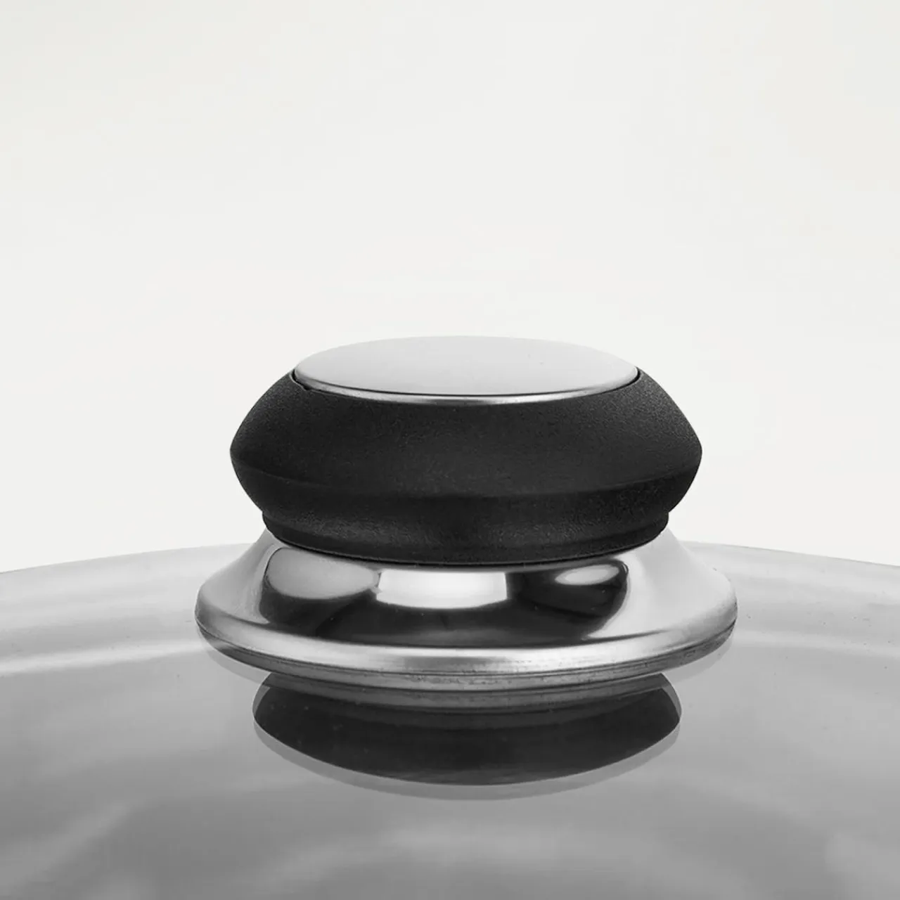 Szklana pokrywka o średnicy 24 cm posiada wygodny uchwyt i odpowietrznik – będziesz sprawnie kontrolować proces gotowania ulubionej potrawy.