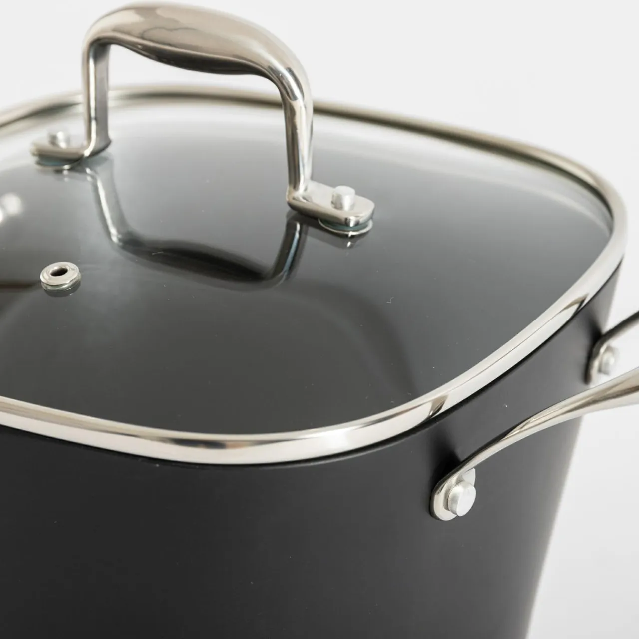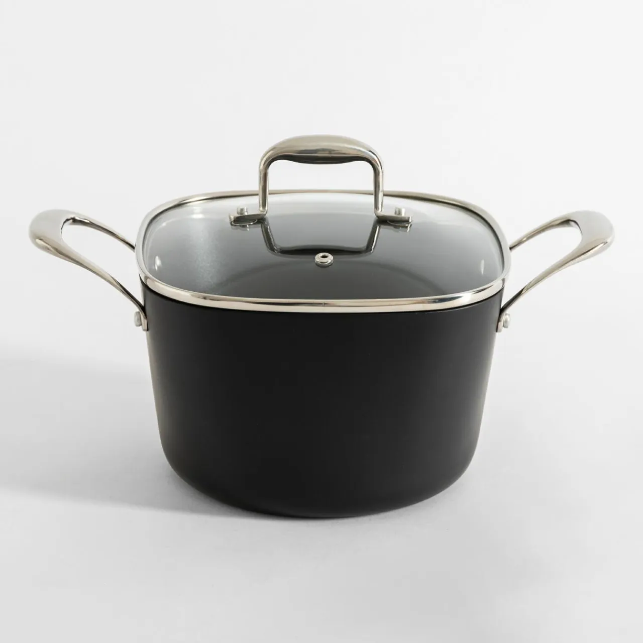 Aluminiowy garnek QUADRATO posiada kwadratową pokrywkę.