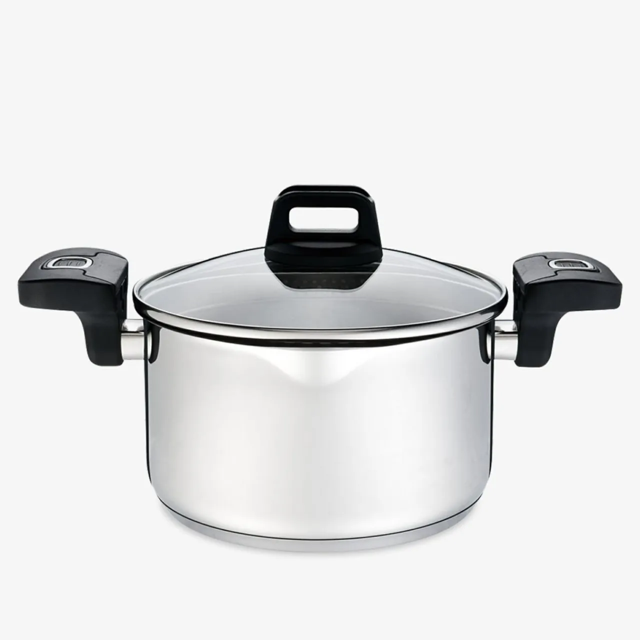 W bocznych uchwytach znajduje się specjalna blokada, dzięki której wygodnie odcedzisz ugotowane warzywa.