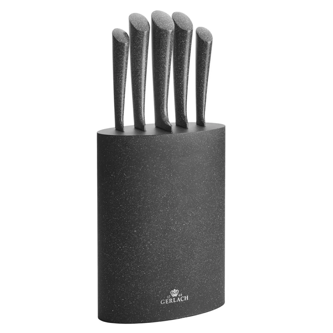 Stalowe rękojeści są pokryte granitową powłoką. Całość jest umieszczona w eleganckim bloku z lakierowanego drewna bukowego.